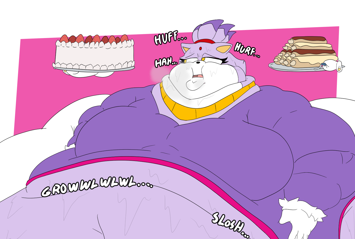 >>103716 First image here gives me the impression that she's getting extremely lethargic from stuffing herself with so much sugar, slowly dozing off while her fat folds envelope her in their warmth. The next time she opens her eyes, she'll either be lying in bed as thin as usual, or pinned down by hundreds of pounds in lard, the plush ground beneath her caking her body in frosting as the overpowering scent of chocolate wafts over her.