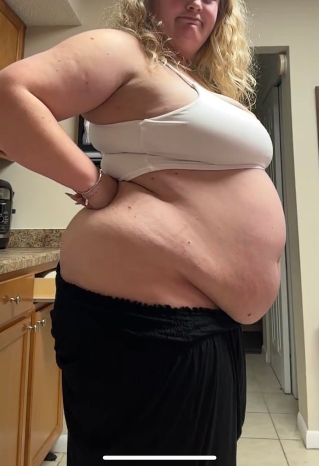She just has such a nice big and bloated belly. Her ass and thighs have been widening out in size too, but what gets me is her fat arms and double chin which aren't normally highlighted but when you look in the corner of her belly pics you see her puffed out arms and flabby chin hanging out, shit is so hot. She could be the goat if she keeps packing them on.
