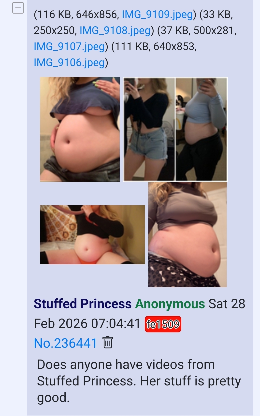 That mega file once has been around for several years and used to have many of her vids but someone went and cleared it out and only left that one video. Also on the last stuffed princess page on here like a week ago before the mods deleted it someone dropped a gofile link that had many of her vids but the link has expired.