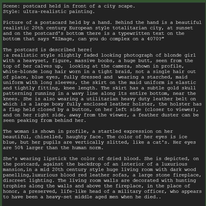 ZImage Turbo used with Qwen_3_4b for CLIP. Qwen_3_4b is a language model that understands things, so this combo can do complex prompts (20k tokens?) and compose images..with okay-ish adherence (check the 1st two images) but of course it'll run for much longer then. The only drawback is that if you describe any features of an object or person which aren't supposed to be seen from the viewing angle you specify, the model WILL change the angle to make them seen. I think if you want to use a specific character with ease, you have to make a lora - because editing detailed prompts to exclude details that momentarily cannot be seen is a pain. It runs okay on a 4070, or even 3060, with decent generating times. (1280x1024 in ~30 secs). If you want previews in okay resolution, can go down to 12 seconds or even less if low. The fp8 model is just 6gb. Not censored but has shit data on nsfw items so doesn't draw them well. Loras for that are out. It does render fatties out of the box decently up to a respectable size but struggles with ssbbw sizes as it doesn't really know how to do belly aprons and fat folds and so on. Stretchmarks etc no dice either, but seems to do okay on cellulite etc. There's few loras for it yet... just released last week.