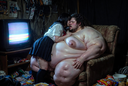 第四张图:人物爆肥,胖得轮廓圆润丰满,高体脂率高体重,赘肉肥硕向外溢出,体型庞大肥满,四肢粗胖,臀部腿部和手臂胖得没有缝隙,大肚腩圆滚滚,面部又大又圆胖乎乎的,脸颊过度饱满,整体膨胀肥胖。极端严重肥胖,夸张extremely obese,远超最胖级别的SSBBW。字幕:控制不住