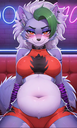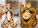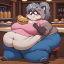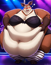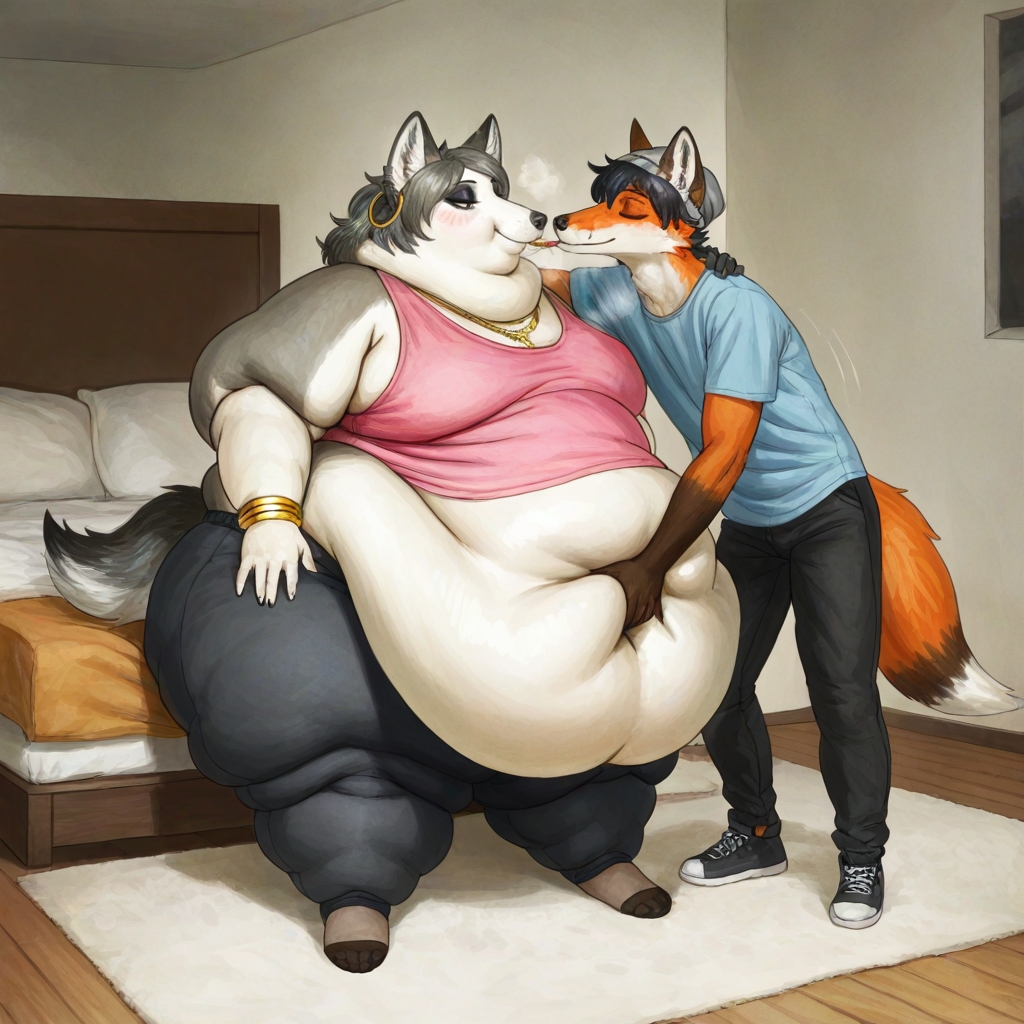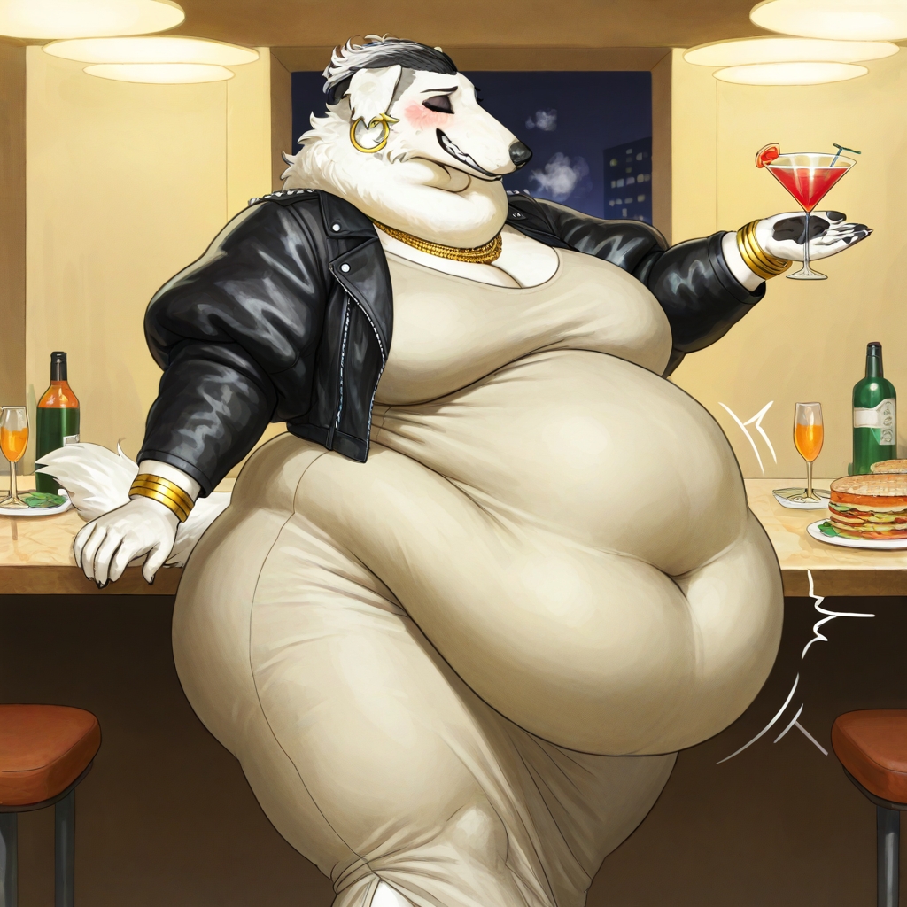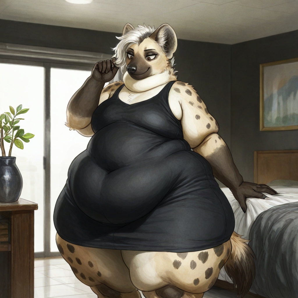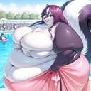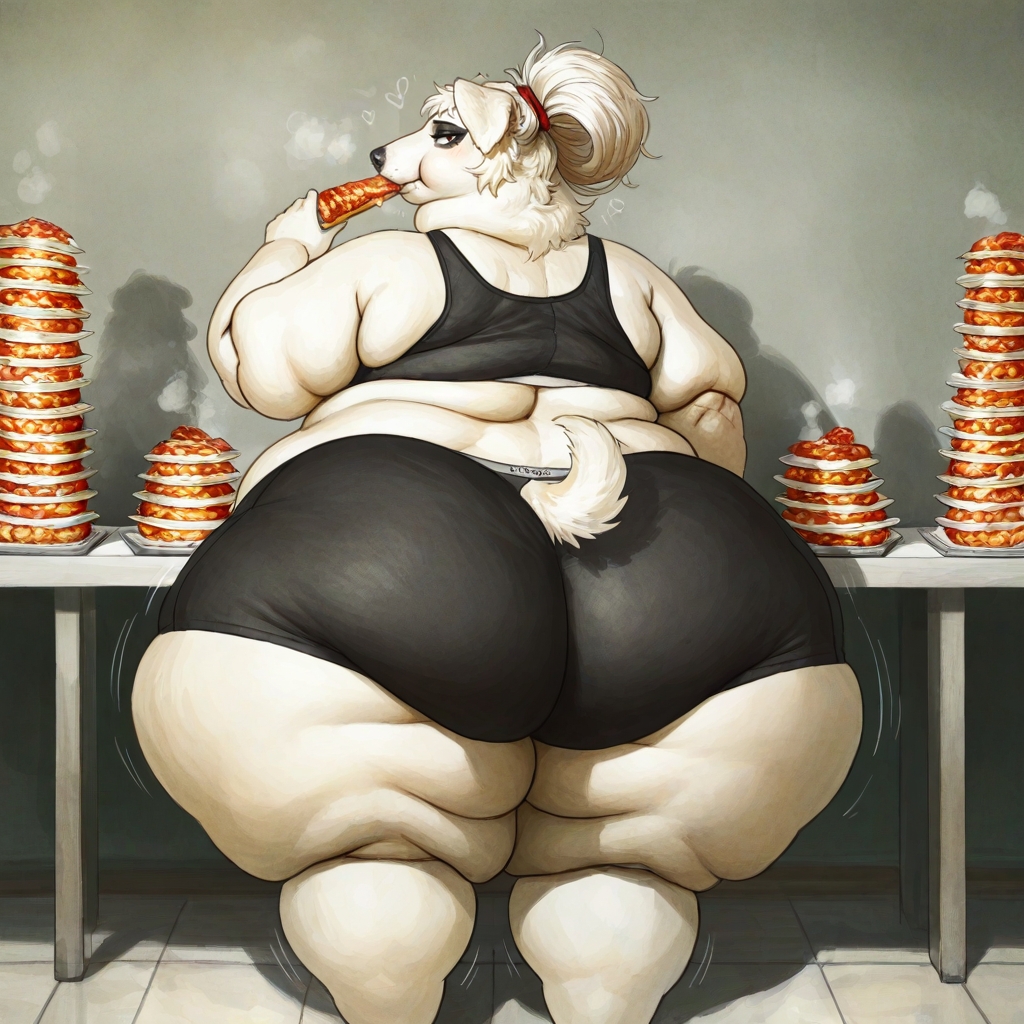 highly detailed CGI render depicting a hyper obese short sassy 500lbs stylized emo anthro leopardgecko slob leaning backwards with her massive round blubbery middle dragging on the ground, extremely bloated, fully clothed wearing muumuu, sweaty baggy black tshirt with "FOOD BLIMP" printed on it, monstrously obese cheeks, her monstrously obese double chin is squished against her chest, monstrously obese groin fupa dragging on the ground between her short legs, extremely obese short arms out to her sides, fat smothering her face, acne, she is at a public country fair, grassy ground, sunshine, winged eyeliner, pretty eyes, dark purple messy emo hair with messy ponytail, side view, candid shot. there are a few anthro characters in the background,