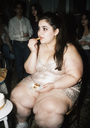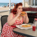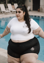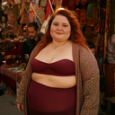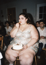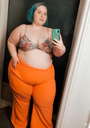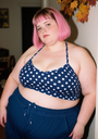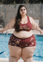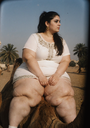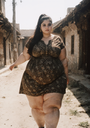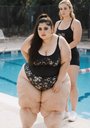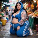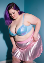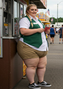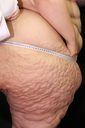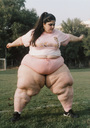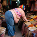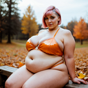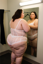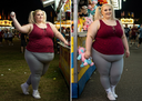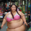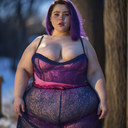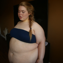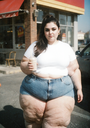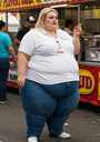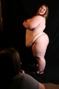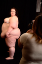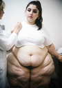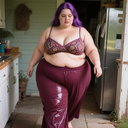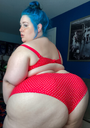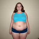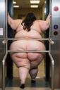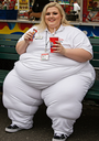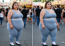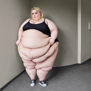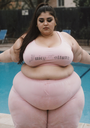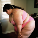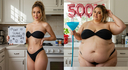 in the after picture her bikini doesnt fit, her skin is marbelled with skin folds, she has expanded into a gigantically wide mountain of fat and creases spill outward in all directions, is impossibly obese, she is rapidly growing fatter, she is beyond the fattest woman in the universe, magic weight gain has caused her to grow to impossible fatness, every limb is extremely obese, particular emphasis on her fluffy obese arms with creases, her layered fat rolls ressembling Michelin mascot, obese cheeks, happy pleasure. shrugging one shoulder, one hand on her waist, measuring tape, poses sideways, blender jar with tons of butters.