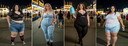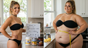 natural colors, daytime, sunrays, blury background, before after comparison full body photos of impossibly weight gain in 5 years of female argentinian college student, extremly tanned skin, she wears natural makeup, eyeliner wing, fake eyelashes, blonde ponytail, brown eyes, freckles, neck choker, black twisted bandeau bikini, sideview at her kitchen, with lots of enormous jars with weight gain and body mass suplements and shakes on top of the kitchen counter, tiny white marker board with the written sentence "road to ssbbw" with food doodles at both photos at the same spot.