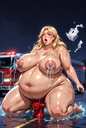 A hyperrealistic photo of a morbidly obese woman with waist-long wet hair, extremely overweight, with wide hips, fat arms, and a huge bust, relaxing in hamam with steam and warm light, relaxed pose.