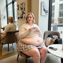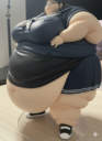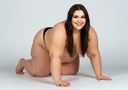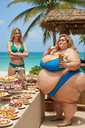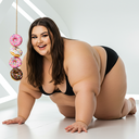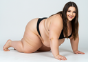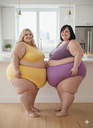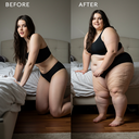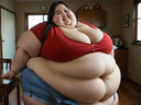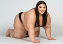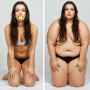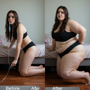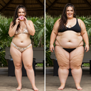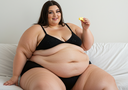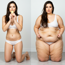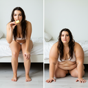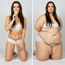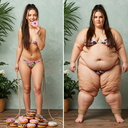 4k realistic photo in direct lighting. Full body image before and after. Beautiful happy uk uni student, mid twenties wearing light touch rock makeup. She has long dark brunette straight hair with dark brown eyes, thick eyebrows, and long lashes. She is in a white fat room, crawling on her hands and knees next to her bed in damp underwear. Before she is slim, eating butter. After she is now very obese with fat legs, a shaved fupa. She smirks with lust. Her double chin and neck is huge and round. She has fat rolls on her knees, wide fat calves, fat rolls merging between her calf and foot, chubby feet, fat arms. Her toes are huge and round inflated fat. Her upper arms are huge and round. Her arm fat rolls over her elbows, and her fingers look puffy. Her fingers look inflated fat. Her skin is damaged from gaining weight.