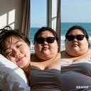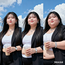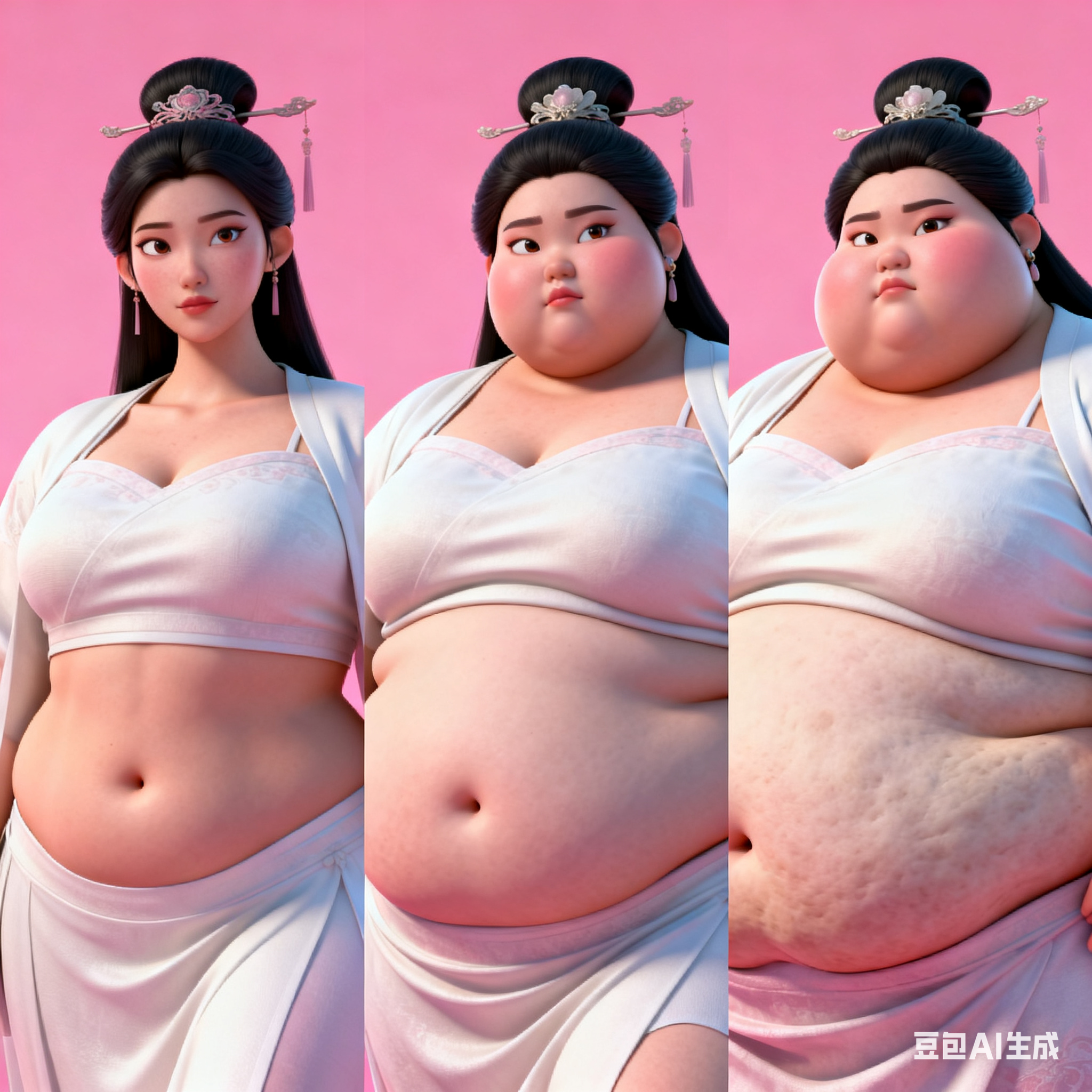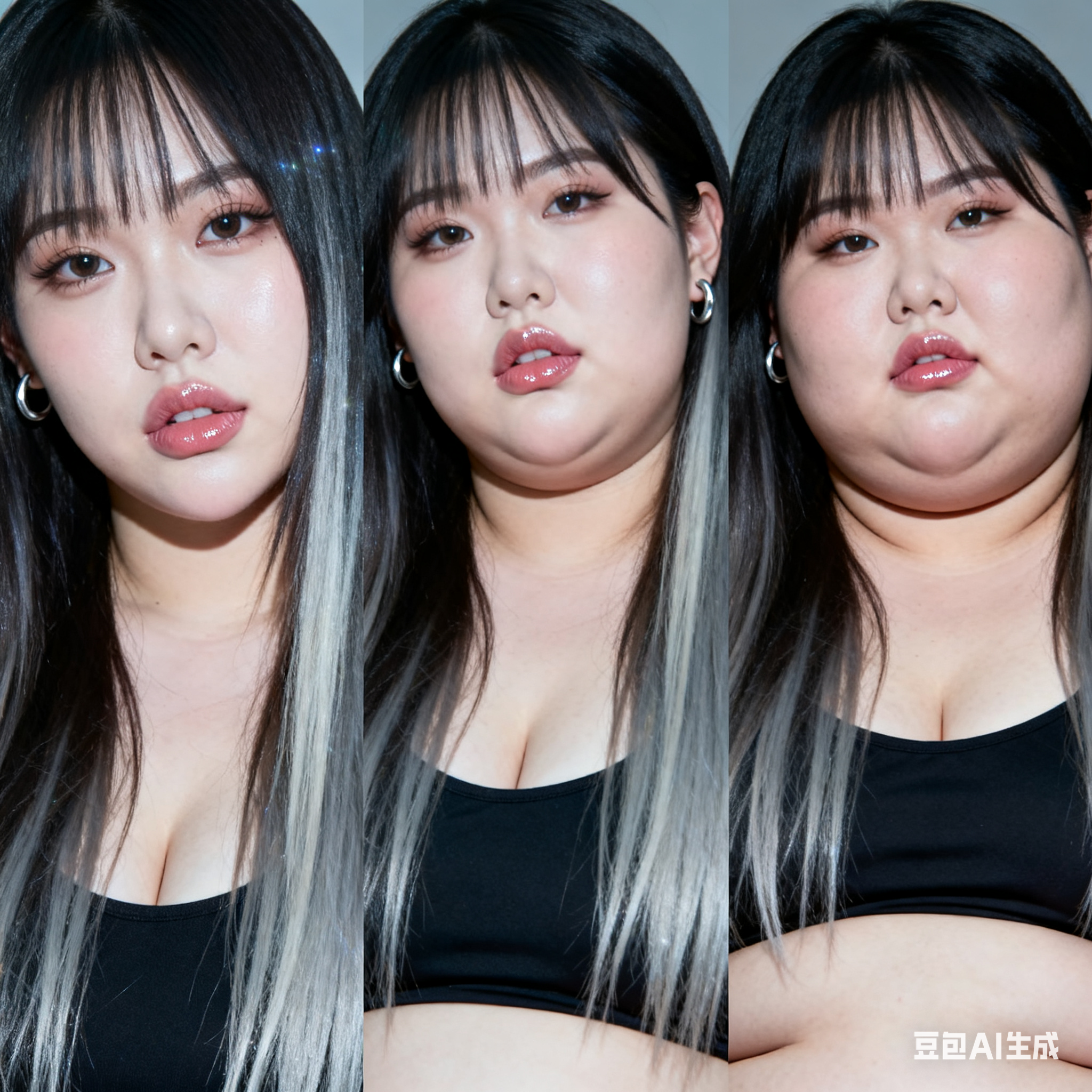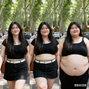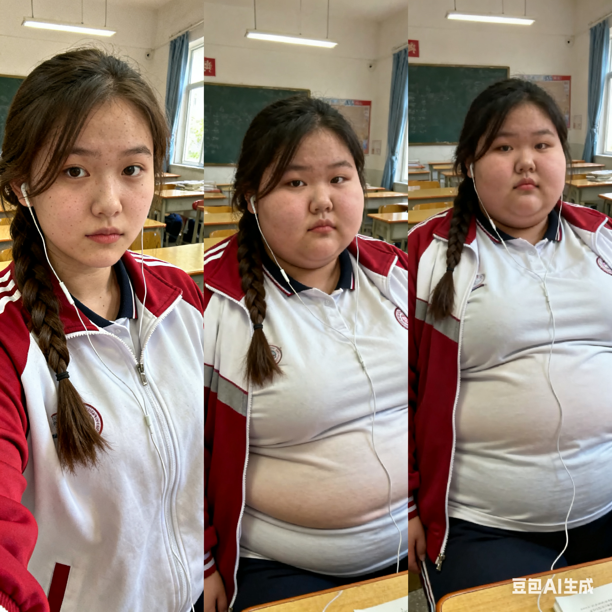 由三个平凡无奇的瞬间组成变胖对比图,展现爆肥带来的所有部位的肥满化巨变。左中右三格构图。平凡无奇的低分辨率随手一拍。 女主保持眉眼与造型统一,强调变胖爆肥逐步变化。人物越来越胖得轮廓圆润丰满,高体脂率高体重,赘肉肥硕向外溢出,体型庞大肥满粗胖并且胖得没有缝隙,圆滚滚的,面部又大又圆胖乎乎的,脸颊过度饱满,整体膨胀肥胖。极端严重肥胖,夸张extremely obese and massive。从左到右排布三个阶段,变胖变油腻。 圆润丰满->夸张爆肥完全走形->极端严重肥胖像是肉山。 左图女主超重但有明显肌肉线条,紧致丰满脸比较圆。中图女主到达非常肥胖的程度,完全走形,体脂率暴涨。脸要更大更圆更双下巴,补充肉鼓鼓的脸颊。腹部至少要有两层游泳圈,靠下方的那层会更加向外突出。右图女主彻底超越想象的肥胖堕落,比世界最胖的还要胖得多,非常胖得没有轮廓完全变成一座肉山,赘肉大量向外溢出,夸张庞大圆润和肥满,面部胖得难以辨认脸更胖更肉鼓鼓。