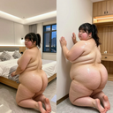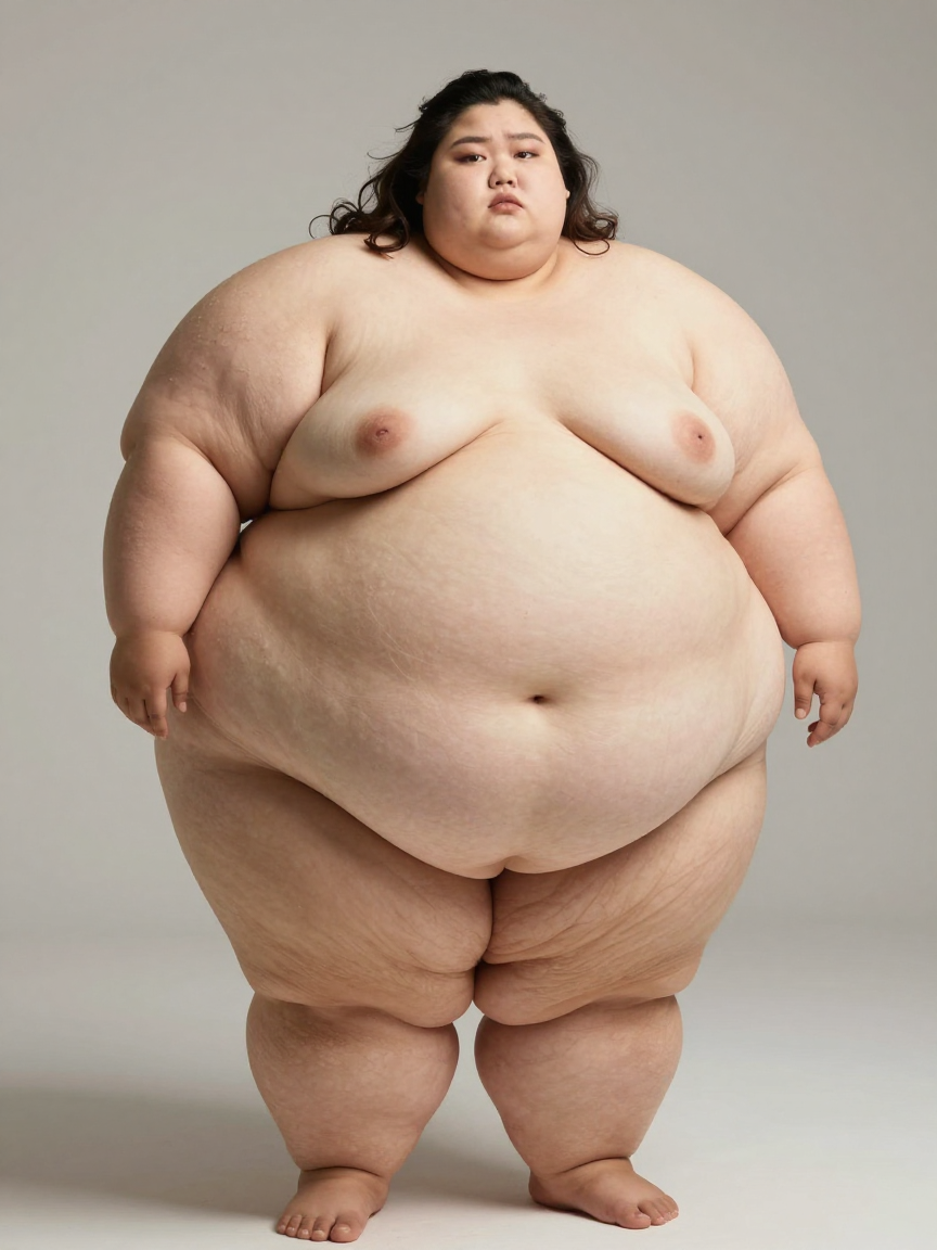 massive. —— Bad lighting, wide angle. The subject should appear to be the fattest woman on earth, extremely super-obese. Extreme overwhelming body squishes against things. Body fat hangs loosely and is extremely voluminous and doughy. Preserve the subject's extreme body type exactly. Pose is natural, playful, and imperfect; composition is asymmetrical. Subject is grotesquely huge with fat, like a blob; she is like an ocean of fat. Pose should be different from the input image.女主是东亚少女。