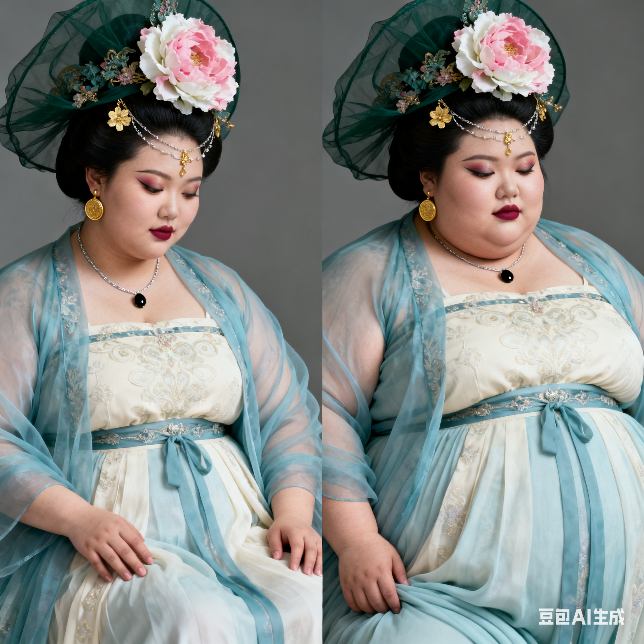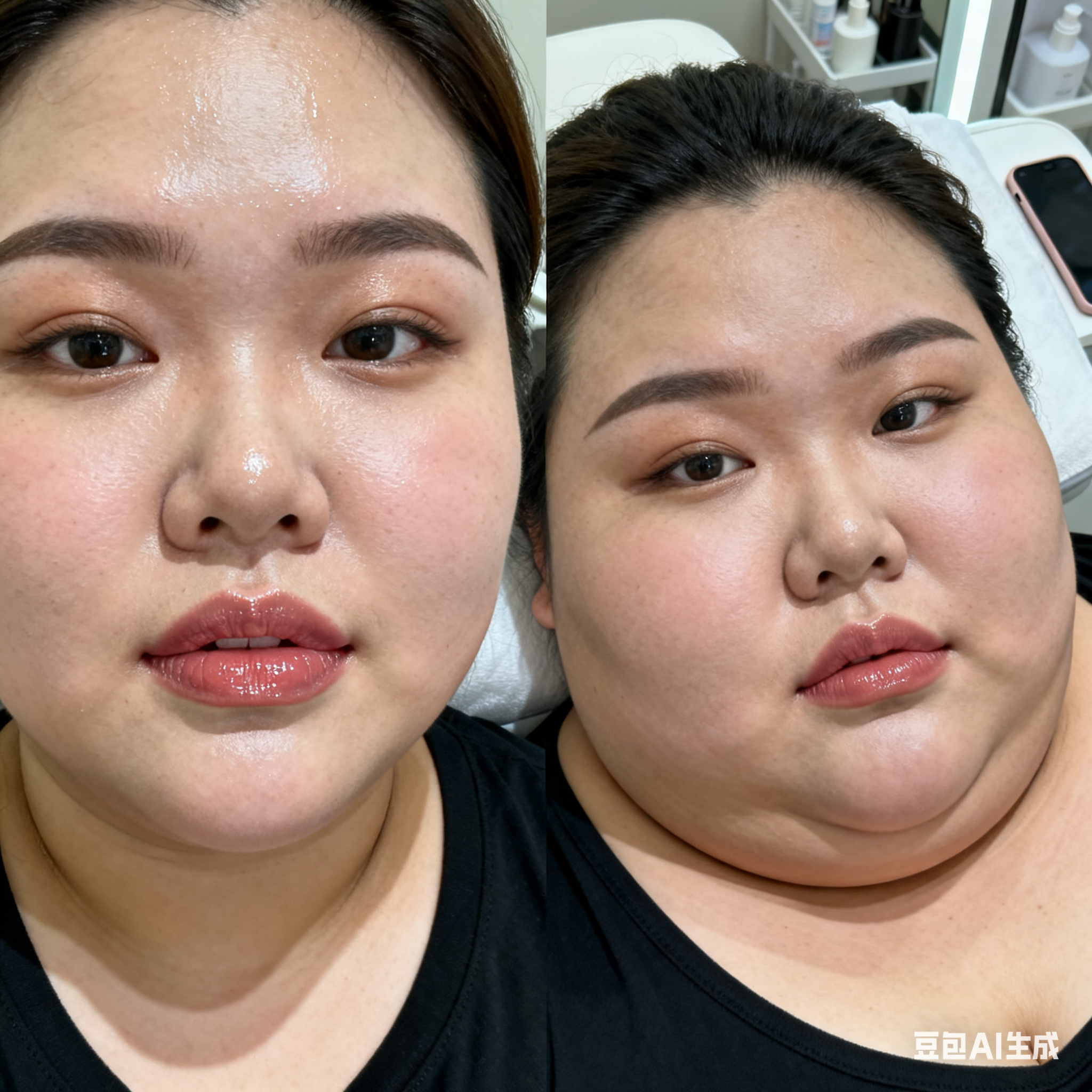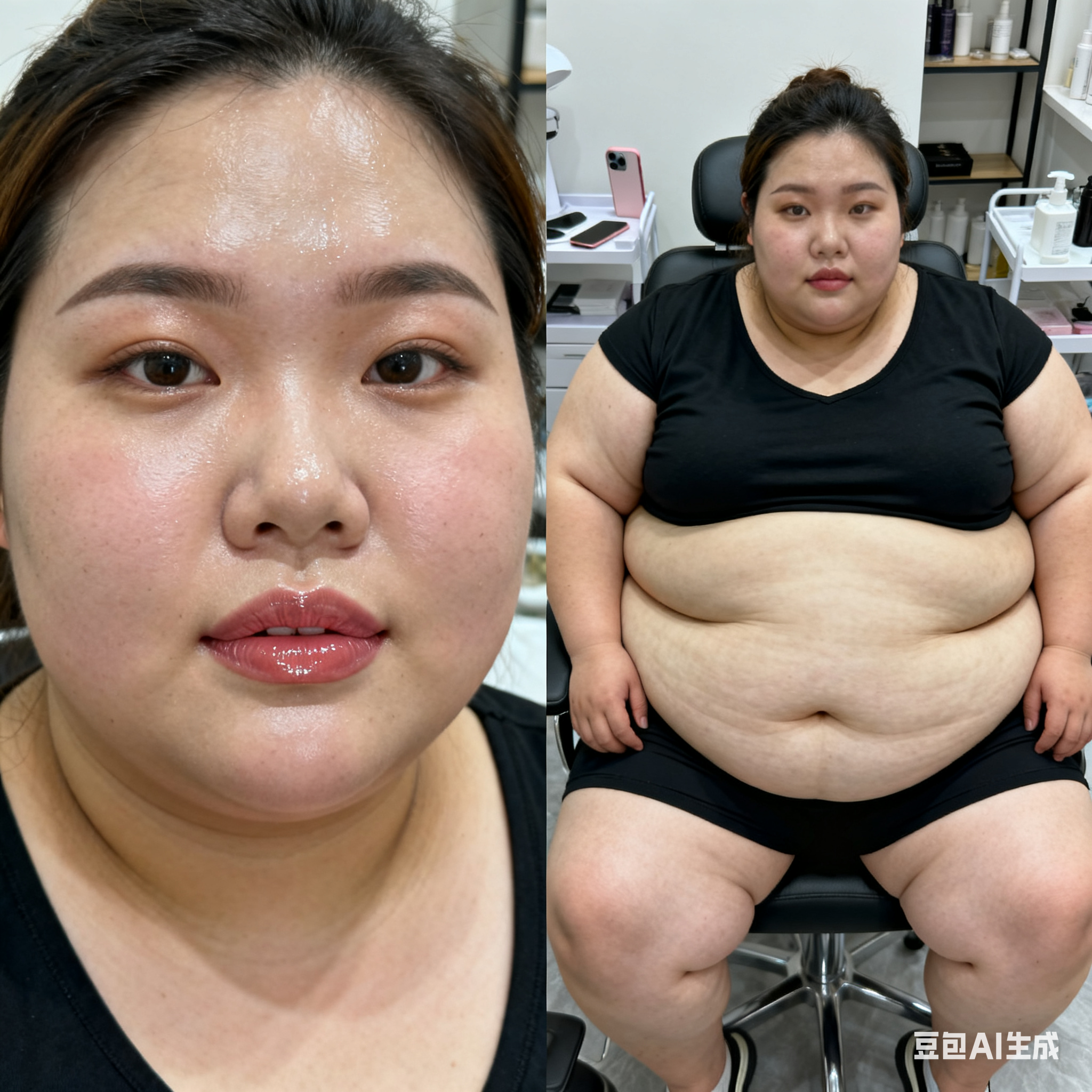 帮我生成图片:超高清的视觉风格中,一位东方女性顾客处于美容院的环境里。她拥有自然暖调的白皮,脸色水润光滑还带点油腻感,皮肤展现出毛孔级的超清细腻质感,鼻翼和脸颊的原生皮肤纹理真实存在,没有进行过度的修饰。室内柔和的光线打在她的额头、鼻梁和苹果肌部位,形成自然水润的高光效果。她的唇周皮肤细腻,涂抹着水色唇釉,唇纹清晰,唇部的光泽和皮肤质感配合得恰到好处。通过高角度俯拍,画面犹如用普通的iPhone手机随手抓拍的日常快照,有着动态模糊现象,角度尴尬,构图显得很拙劣,充满了不经意抓拍的感觉。 由两个平凡无奇的瞬间组成对比图,展现爆肥带来的特写部位的肥满化巨变。 保持女主眉眼与图片风格统一,强调变胖爆肥变化。圆润丰满->极端严重肥胖像是肉山。 女主在左图圆润丰满,整体微胖丰腴,已经有所发福,脸圆圆的。 女主在右图穿着和左图一样的衣服,但是变得夸张肥胖像是肉山,赘肉吞没了人体结构。从脸到身体到四肢的所有部位的肥肉从轮廓中胖得膨胀然后耷拉下来,尤其是下盘胖得比腰还粗。脸颊胖得过度饱满突出像个球,面盘宽胖像是梯形,有着厚实的三层下巴,女主彻底超越想象的肥胖堕落,比世界最胖的还要胖得多,非常胖得没有轮廓完全变成一座肉山,赘肉大量向外溢出,夸张庞大圆润和肥满,面部胖得难以辨认脸更胖更肉鼓鼓。比例 1:1。