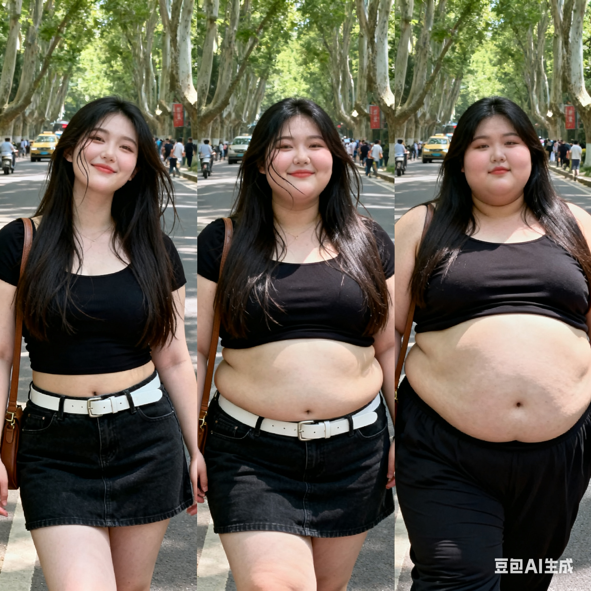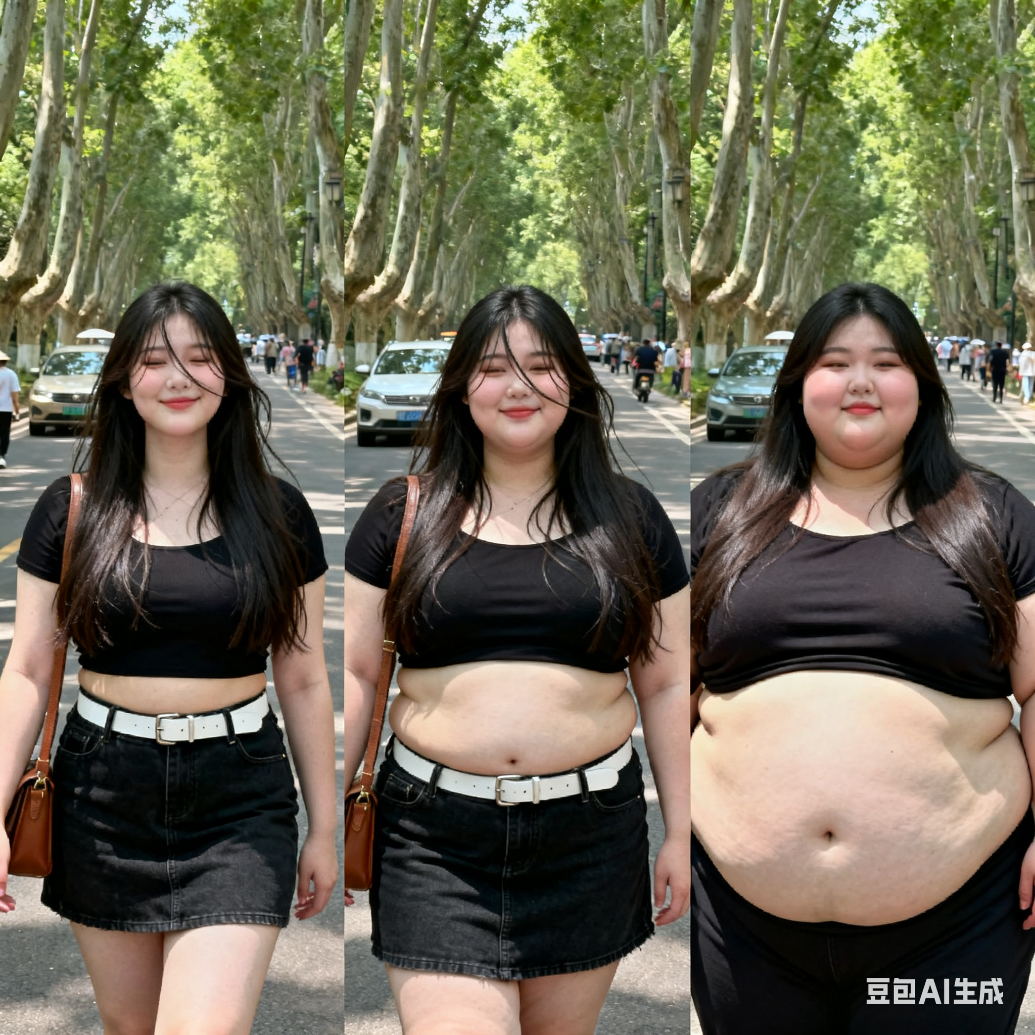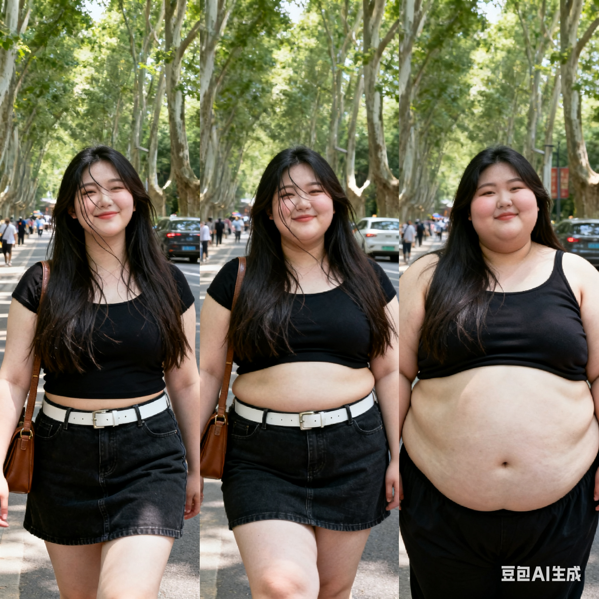 由三个平凡无奇的瞬间组成变胖对比图,展现爆肥带来的从脸到所有部位的肥满化巨变。左中右三格构图。平凡无奇的低分辨率随手一拍。 女主保持眉眼与造型统一,强调变胖爆肥逐步变化。人物越来越胖得轮廓圆润丰满,高体脂率高体重,赘肉肥硕向外溢出,体型庞大肥满粗胖并且胖得没有缝隙,圆滚滚的,面部又大又圆胖乎乎的,脸颊过度饱满,整体膨胀肥胖。极端严重肥胖,夸张extremely obese and massive。从左到右排布三个阶段,变胖变油腻。 圆润丰满->夸张爆肥完全走形->极端严重肥胖像是肉山。 左图女主超重但有明显肌肉线条,紧致丰满脸比较圆。中图女主到达非常肥胖的程度,完全走形,体脂率暴涨。脸要更大更圆更双下巴,补充肉鼓鼓的脸颊。腹部至少要有两层游泳圈,靠下方的那层会更加向外突出。右图女主彻底超越想象的肥胖堕落,比世界最胖的还要胖得多,非常胖得没有轮廓完全变成一座肉山,赘肉大量向外溢出,夸张庞大圆润和肥满,面部胖得难以辨认脸更胖更肉鼓鼓。