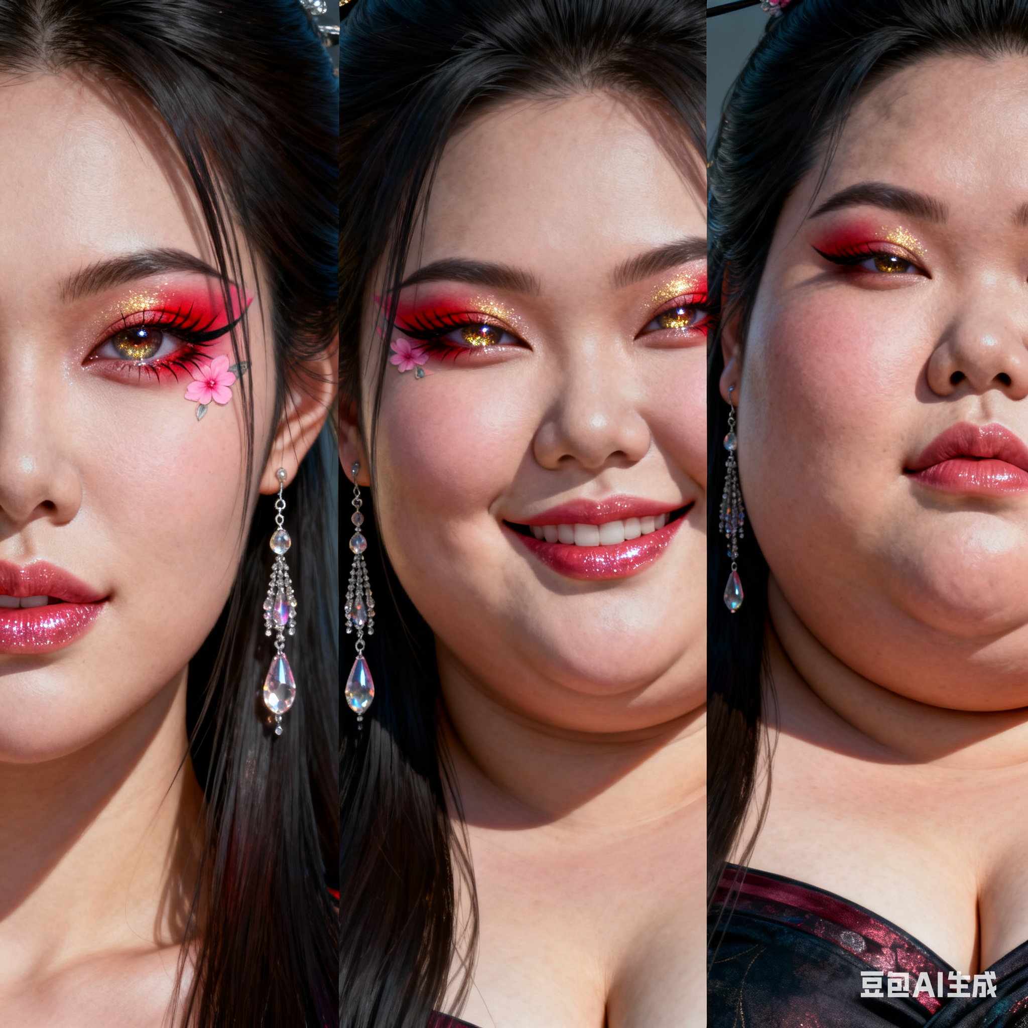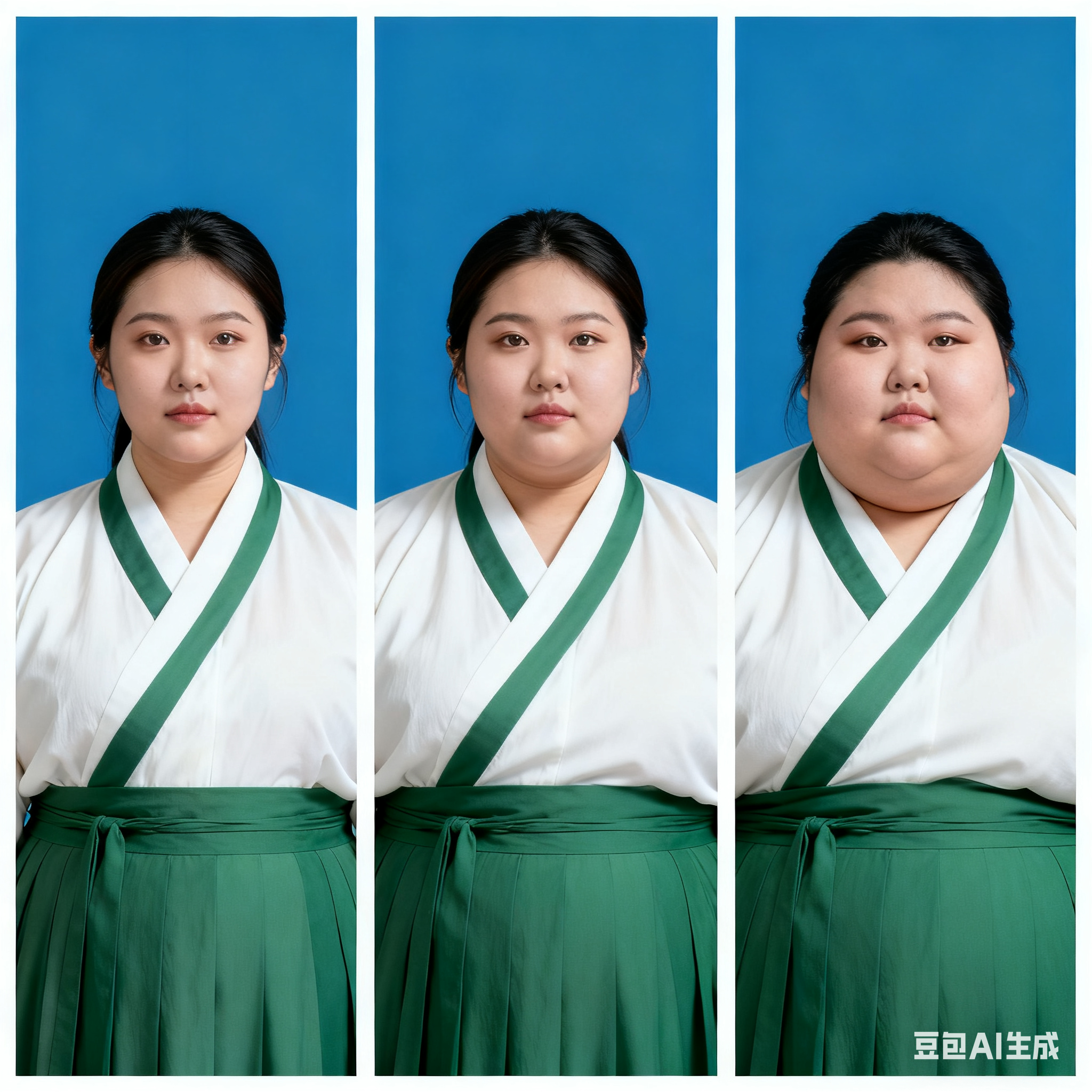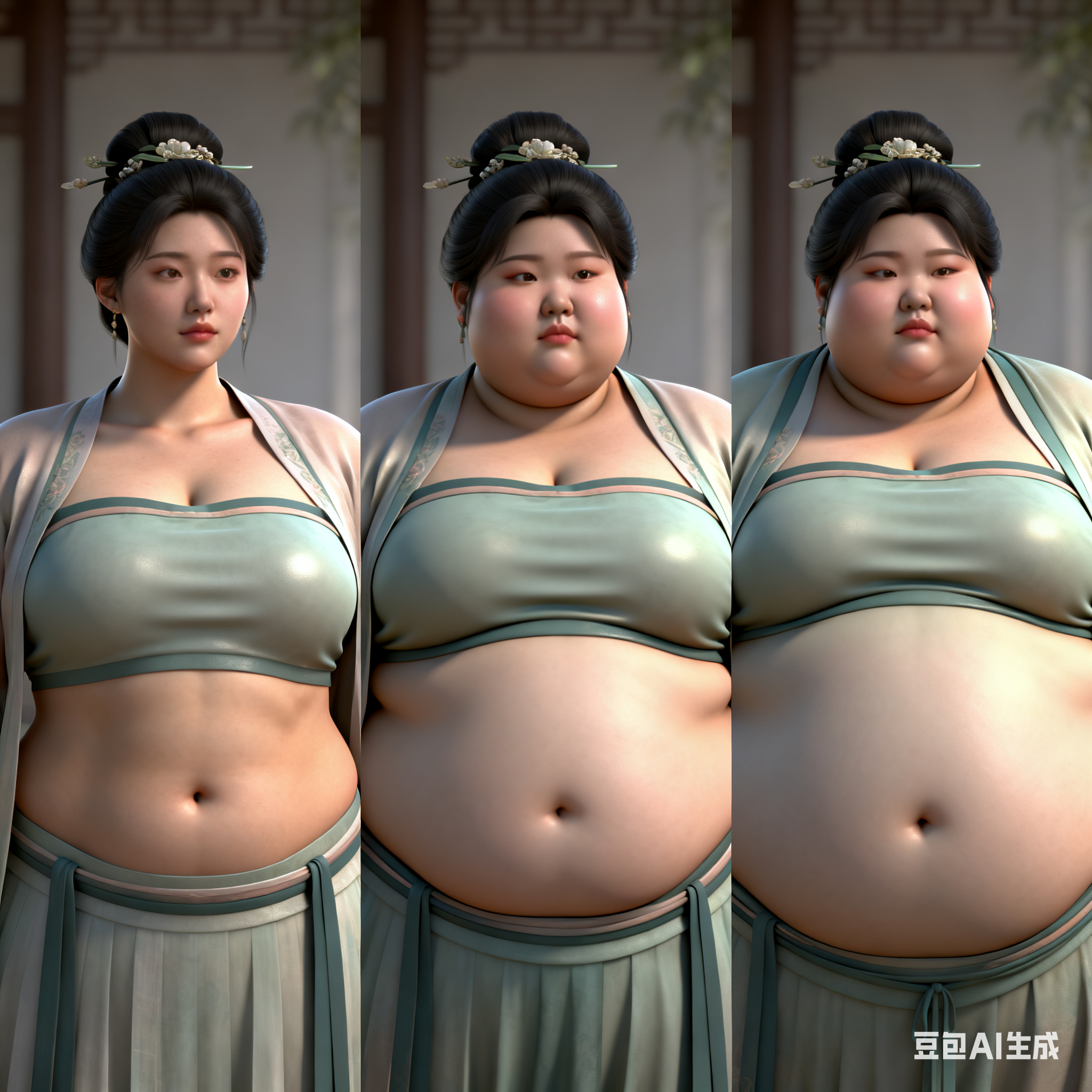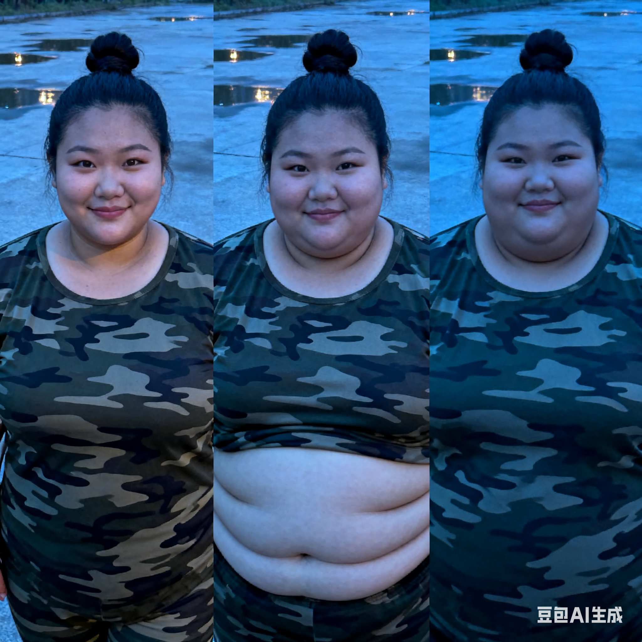 由三个平凡无奇的瞬间组成变胖对比图,展现爆肥带来的从脸到所有部位的肥满化巨变。左中右三格构图。平凡无奇的低分辨率随手一拍。 女主保持眉眼与造型统一,强调变胖爆肥逐步变化。人物越来越胖得轮廓圆润丰满,高体脂率高体重,赘肉肥硕向外溢出,体型庞大肥满粗胖并且胖得没有缝隙,圆滚滚的,面部又大又圆胖乎乎的,脸颊过度饱满,整体膨胀肥胖。极端严重肥胖,夸张extremely obese and massive。从左到右排布三个阶段,变胖变油腻。 圆润丰满->夸张爆肥完全走形->极端严重肥胖像是肉山。 左图女主超重但有明显肌肉线条,紧致丰满脸比较圆。中图女主到达非常肥胖的程度,完全走形,体脂率暴涨。脸要更大更圆更双下巴,补充肉鼓鼓的脸颊。腹部至少要有两层游泳圈,靠下方的那层会更加向外突出。右图女主彻底超越想象的肥胖堕落,比世界最胖的还要胖得多,非常胖得没有轮廓完全变成一座肉山,赘肉大量向外溢出,夸张庞大圆润和肥满,面部胖得难以辨认脸更胖更肉鼓鼓。