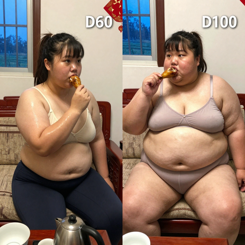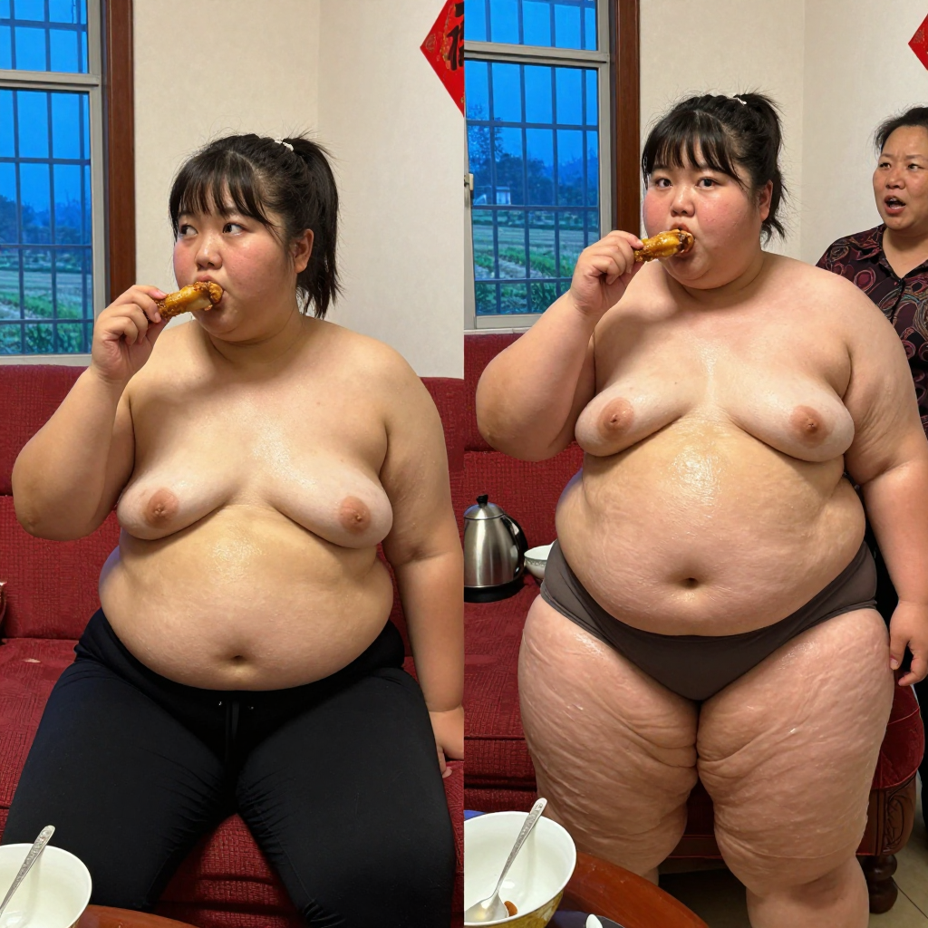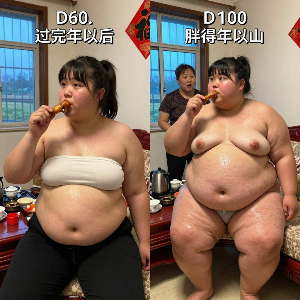 pt2 随手拍的手机摄影风格,人物体型文艺复兴油画风格。主角是20岁的女性,中国人。照明不均 ,女主始终坐在沙发上,手里拿着鸡腿在吃,双眼无神。人物偏侧面角度,超近景拍摄。完全素颜,大饼脸,两颊很胖双下巴明显,黑黄皮,高鼻梁,平直粗眉,大眼睛双眼皮,小嘴,肚腩很大。两张图始终穿着抹胸和秋裤,高马尾有刘海。皮肤因出汗冒油而反光,闪光灯效果。 家庭客厅里,2015年的装修风格,简洁的石灰墙贴着一张福字,装着防盗网的钴蓝色玻璃窗户,窗外是农村田地景象,红木沙发椅,有点凌乱的茶几,茶几上放着老款的茶具,不锈钢电烧水壶。一个胖胖的熟女站在旁边开口说话。 由两个平凡无奇的瞬间组成对比图,展现爆肥带来的特写部位的肥满化巨变。 保持女主眉眼与图片风格统一,强调变胖爆肥变化。 显然肥胖->极端严重肥胖像是肉山。she gained over 600lbs. 女主在左图胖得像是肥猪,有着宽大的胖脸和过度饱满的脸颊,非常肉乎乎的,身材完全走形高体重高体脂率。肚腩圆滚滚地突出。上方字幕:D60.下方字幕:过完年以后 女主在右图穿着和左图一样的衣服,但是变得夸张肥胖像是肉山,赘肉吞没了人体结构。 从脸到身体到四肢的所有部位的肥肉从轮廓中胖得膨胀然后耷拉下来,尤其是下身胖得比腰还粗。 脸颊胖得过度饱满突出像个球,面盘宽胖像是梯形,有着厚实的三层下巴,女主彻底超越想象的肥胖堕落,比世界最胖的还要胖得多,非常胖得没有轮廓完全变成一座肉山,赘肉大量向外溢出,夸张庞大圆润和肥满,面部胖得难以辨认脸更胖更肉鼓鼓。.有三层游泳圈,靠下方的那层会更加向外突出,肥肉填满两腿之间的空间。上方字幕:D100.下方字幕:胖得不成形