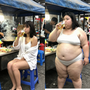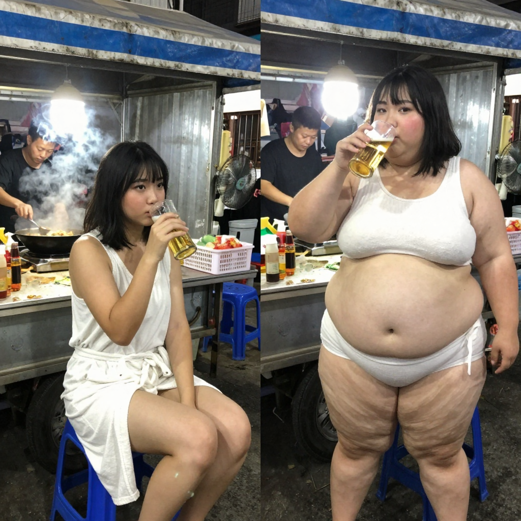 随手拍的过曝的手机摄影。主角是16岁的校花,中国人。照明不均 ,女主坐着看向镜头喝啤酒。侧面角度。完全素颜,方圆脸,两颊很胖双下巴明显,黑黄皮,高鼻梁,平直粗眉,大眼睛双眼皮,小嘴。穿着浴袍,齐肩短发。 城市夜市一角,2012年的风格,摊位是简易铁皮车,挂着褪色的蓝白条纹遮阳篷,车前摆着塑料凳,地面是灰扑扑的水泥地,摊主在炉灶前炒菜,锅里油烟升腾,旁边是装满食材的塑料筐,桌面上放着油腻的调料瓶和旧电风扇。 由两个平凡无奇的瞬间组成变胖对比图,展现爆肥带来的特写部位的肥满化巨变。 保持女主眉眼与图片风格统一,强调变胖爆肥变化。健康丰满有肌肉->极端严重肥胖像是肥猪。she gained over 600lbs. 女主在左图健康丰满,身材匀称恰到好处,有结实肌肉线条。 女主在右图穿着和左图一样的衣服,但是变得非常肥胖圆润。有着厚实的双下巴,宽大的胖脸和过度饱满的脸颊,非常肉乎乎的,胖得比最胖最肥的情况还要胖体型更圆更庞大,身材完全走形。人物爆肥,胖得轮廓圆润丰满,高体脂率高体重,赘肉肥硕向外溢出,体型庞大肥满,手臂粗胖,赘肉胖得相互挤压,腿部臀部胖得比腰还粗,圆滚滚又肥又大,腹部至少要有两层游泳圈,靠下方的那层会更加向外突出。面部又大又圆胖乎乎的,脸颊过度饱满,整体膨胀肥胖。极端严重肥胖,夸张extremely fat and massive。