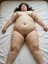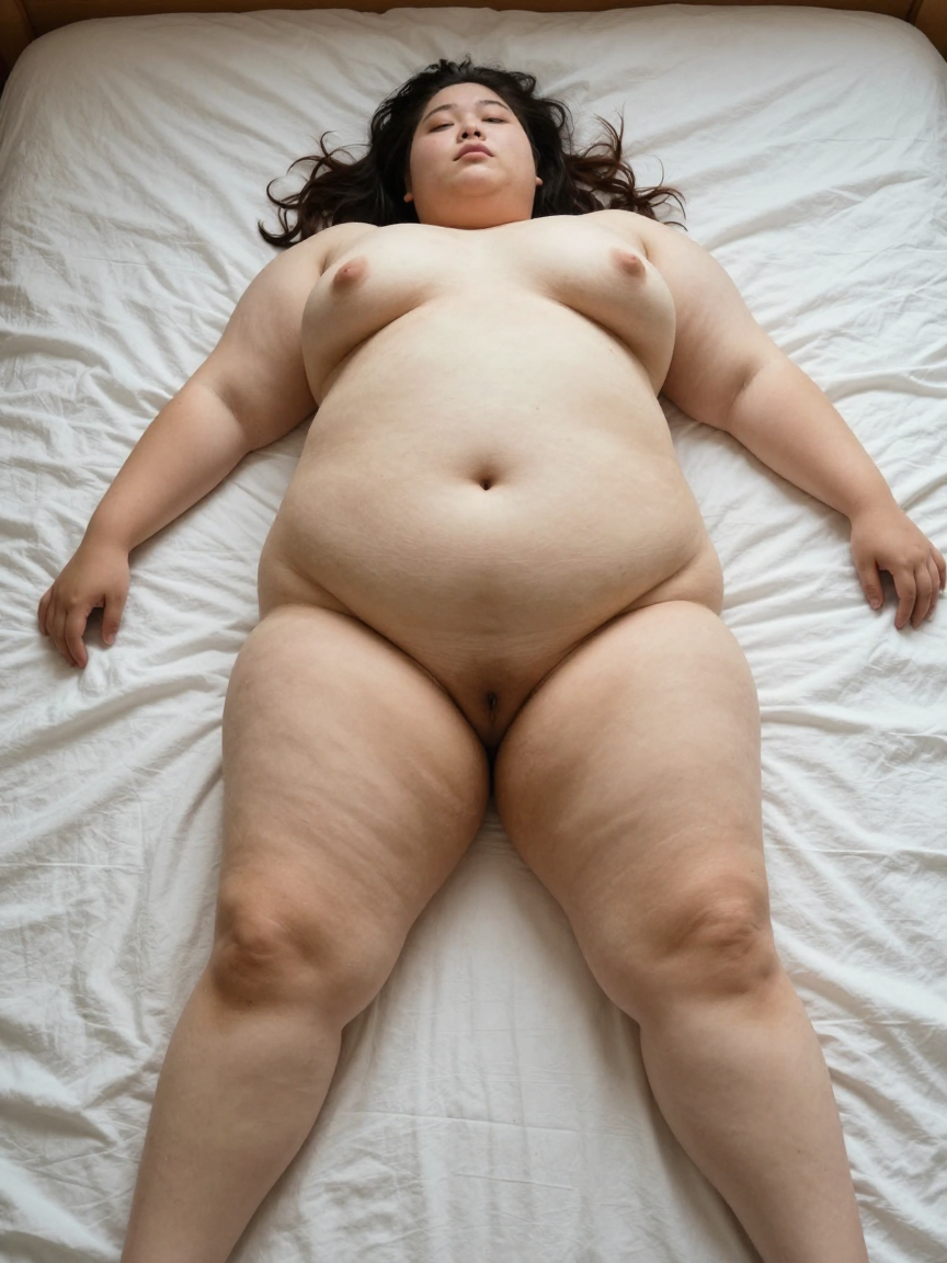 >>39582 Bad lighting, wide angle. The subject should appear to be the fattest woman on earth, extremely super-obese. Extreme overwhelming body squishes against things. Body fat hangs loosely and is extremely voluminous and doughy. Preserve the subject's extreme body type exactly. Pose is natural, playful, and imperfect; composition is asymmetrical. Subject is grotesquely huge with fat, like a blob; she is like an ocean of fat.女主是东亚少女。皮肤因出汗冒油而反光,闪光灯效果。上方视角。细节刻画床单褶皱。