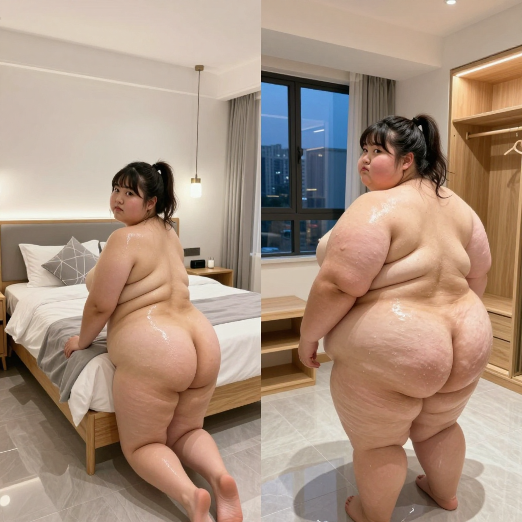>>39322 made her even bigger! —— 随手拍的过曝的手机摄影。主角是16岁的校花,中国人。非常肥胖圆润。照明不均 ,女主趴在床上头回眸,双手扶墙跪在床上撅起屁股,床单湿湿的,皮肤因为出汗冒油而反光。背面角度。完全素颜,大饼脸,冷白皮,高鼻梁,平直粗眉,大眼睛双眼皮,小嘴。赤身裸体,高马尾有刘海。丰乳肥臀,大胖臀部。 现代(2020年)酒店大床房,简约风格装修,暖黄色灯光,浅灰色抛光瓷砖地板,干净整洁的白色墙面,配有简洁线条的原木色家具。一张宽大的布艺床靠着墙,床上铺着整齐的白色床单和灰色羽绒被,配有几个几何图案的靠枕。床头两侧是简约风的壁灯和原木色床头柜,柜上放着电子闹钟和香薰蜡烛。窗户为双层中空玻璃,窗外是城市夜景,窗帘为浅灰遮光布料。房间一角设有嵌入式衣柜,内部配有感应灯带和衣架,地面干净无杂物。整体环境明亮、整洁、富有现代感,体现出舒适的居住体验。 由两个平凡无奇的瞬间组成对比图,展现爆肥带来的特写部位的肥满化巨变。 保持女主眉眼与图片风格统一,强调变胖爆肥变化。 圆润丰满->极端严重肥胖像是肉山。 女主在左图圆润丰满,整体微胖丰腴,已经有所发福,脸圆圆的。 女主在右图穿着和左图一样的衣服,但是变得夸张肥胖像是肉山,赘肉吞没了人体结构。 从脸到身体到四肢的所有部位的肥肉从轮廓中胖得膨胀然后耷拉下来,尤其是下盘胖得比腰还粗。 脸颊胖得过度饱满突出像个球,面盘宽胖像是梯形,有着厚实的三层下巴,女主彻底超越想象的肥胖堕落,比世界最胖的还要胖得多,非常胖得没有轮廓完全变成一座肉山,赘肉大量向外溢出,夸张庞大圆润和肥满,面部胖得难以辨认脸更胖更肉鼓鼓。