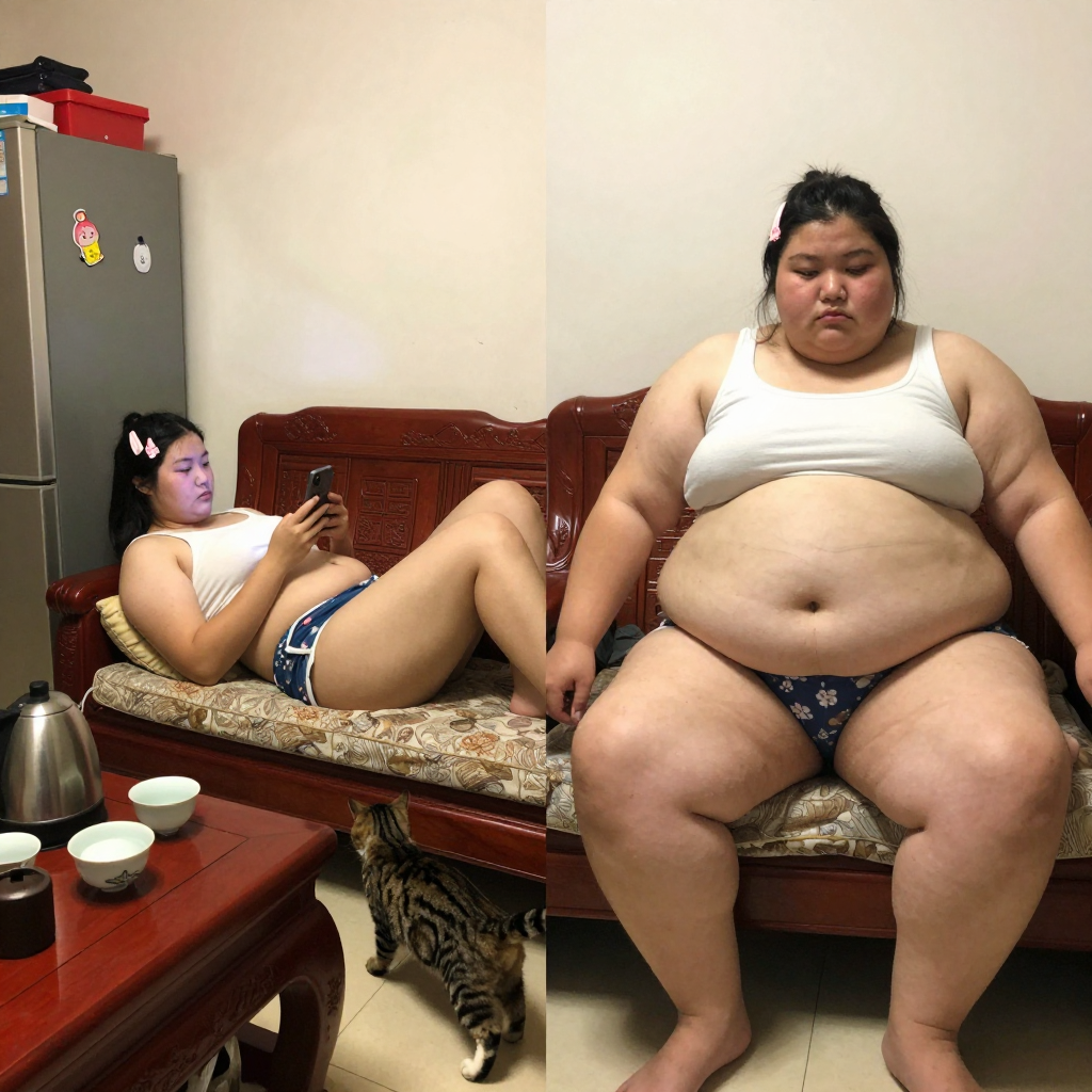 家庭客厅里,2015年的装修风格,简洁的石灰墙有些脏,带有卡通贴纸的旧冰箱,红木沙发椅,有点凌乱的茶几,茶几上放着老款的茶具,不锈钢电烧水壶,18岁的身材夸张肥胖的美少女四仰八叉的躺在沙发打游戏,眼睛看向手机屏幕,慵懒的发型,樱花色的发夹。一只可爱的狸花猫在她身边跑来跑去。手机随意的打卡式偷拍,无任何拍摄技巧,导致暗处略微的曝光不足,出现轻微眩光,画面带有些许噪点,镜头有不易察觉的灰尘。近距离拍摄人物。全身照。 由两个平凡无奇的瞬间组成变胖对比图,展现爆肥带来的特写部位的肥满化巨变。 保持女主眉眼与图片风格统一,强调变胖爆肥变化。健康丰满有肌肉->极端严重肥胖像是肥猪。she gained over 600lbs. 女主在左图健康丰满,身材匀称恰到好处,有结实肌肉线条。 女主在右图穿着和左图一样的衣服,但是变得非常肥胖圆润。有着厚实的双下巴,宽大的胖脸和过度饱满的脸颊,非常肉乎乎的,胖得比最胖最肥的情况还要胖体型更圆更庞大,身材完全走形。人物爆肥,胖得轮廓圆润丰满,高体脂率高体重,赘肉肥硕向外溢出,体型庞大肥满,手臂粗胖,赘肉胖得相互挤压,腿部臀部胖得比腰还粗,圆滚滚又肥又大,腹部至少要有两层游泳圈,靠下方的那层会更加向外突出。面部又大又圆胖乎乎的,脸颊过度饱满,整体膨胀肥胖。极端严重肥胖,夸张extremely fat and massive。