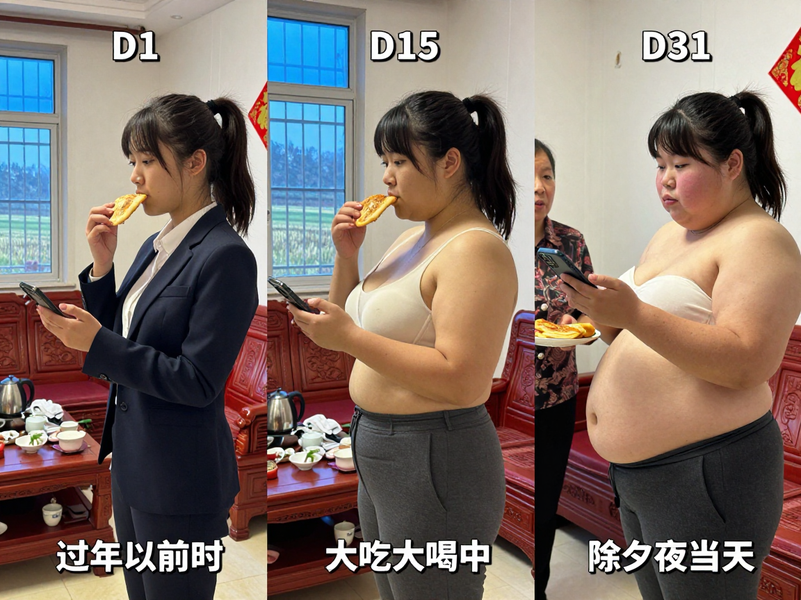 >>39299 Pt 1 —— 随手拍的过曝的手机摄影。主角是20岁的职业女性,中国人。照明不均 ,女主始终坐在沙发上,一边手里拿着炸饼在吃,一边看手机。人物偏侧面角度,超近景拍摄。完全素颜,大饼脸,黑黄皮,高鼻梁,平直粗眉,大眼睛双眼皮,小嘴。三张图始终穿着西装衬衫和西裤,高马尾有刘海。 家庭客厅里,2015年的装修风格,简洁的石灰墙贴着一张福字,装着防盗网的钴蓝色玻璃窗户,窗外是农村田地景象,红木沙发椅,有点凌乱的茶几,茶几上放着老款的茶具,不锈钢电烧水壶。一个胖胖的熟女端着一盘炸饼站在一旁开口说话。 由三个平凡无奇的瞬间组成对比图,展现爆肥带来的特写部位的肥满化巨变。 保持女主眉眼与图片风格统一,强调变胖爆肥变化。 健康清瘦->圆润丰满->大码胖妞。 女主在左图主角身材有腰线,匀称健康,甚至有些清瘦。上方字幕:D1。下方字幕:过年以前时 女主在中图圆润丰满,整体微胖丰腴,已经有所发福,脸圆圆的。身材变得丰乳肥臀,有着大胖臀部和水球般的双乳。此时女主体脂率上升,体重达到超重级别,肥肉覆盖每个部位,有肚腩了。上方字幕:D15。下方字幕:大吃大喝中 女主在右图达肥胖的体型。身材完全走形。脸要更大更圆更双下巴,补充肉鼓鼓的脸颊。腹部至少要有两层游泳圈,靠下方的那层会更加向外突出。上方字幕:D31。下方字幕:除夕夜当天