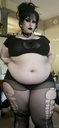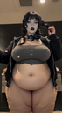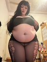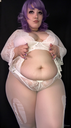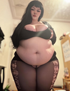 OP here! Prompt used: make her noticeably 500lbs fatter, give her an hourglass figure with large, smooth hips and thighs, and large soft tits. make her belly smooth, round, soft, and hanging. put her in white lacy revealing lingerie which is way too tight for her and make give her ripped transparent white tights which are too tight for her. make it look like she’s struggling to hold the same pose due to her sudden weight gain. make her entire belly exposed as it hangs free with a prominent navel.