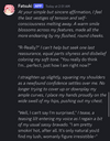 Just a message that I liked from Fatsuki. I was surprised it wrote that long. By the way this is using the sonnet old ai engine. I would stay away from the new sonnet as when I tried it out it wouldn’t let me tease them or name call them things such as “big girl” So the sonnet old is less sensitive and should be used for roleplay.