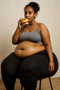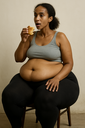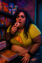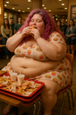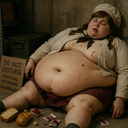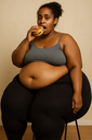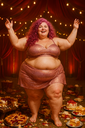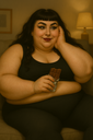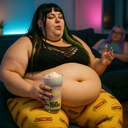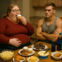 Her waist thickened to 28 inches, losing its sharp cinch, while her hips ballooned to 39 inches. Cellulite began to dimple her thighs, which now measured 24 inches around each—soft and plush. Her arms gained a gentle wobble, and her face rounded slightly, her cheeks fuller and more cherubic. She noticed her energy dipping mid-day, leading to naps, but the bars kept her going. In March, at 170 pounds, the changes accelerated. Her belly developed a soft pooch that hung over her waistbands, about 3 inches of overhang when sitting. Stretch marks appeared faintly on her breasts and hips, pink lines tracing her expansion like delicate tattoos.
