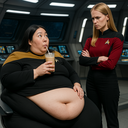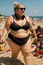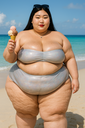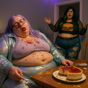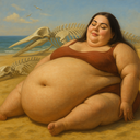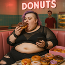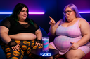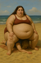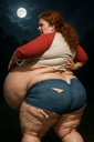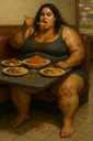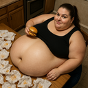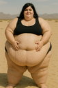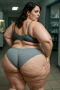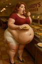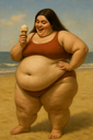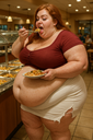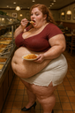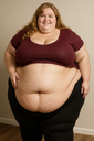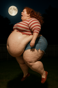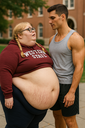 In May, at 220 pounds, mobility changed. Stairs left her breathless, her massive bust heaving with effort. Stretch marks deepened, spiderwebbing across her belly, which now protruded 5 inches when relaxed—a doughy apron that jiggled with laughter. Her buttocks grew to epic proportions, each cheek round and firm yet soft, measuring about 22 inches across together. She had to buy new bras online, custom 40H, but even those overflowed. Dates noticed; some were intimidated by her size, others entranced. Emily, ditzy as ever, thought, "I'm just filling out nicely!"