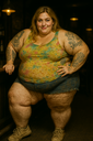 November, 370 pounds: Mobility scooter considerations, but she walked (waddled) on. Belly apron reached mid-thigh, stretch marks vivid. Energy waned, but bars helped.