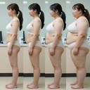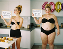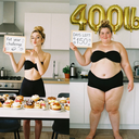 In the before picture she is extremely skinny and fit, held a tiny white marker board with the written sentence "fat year challenge" with food doodles, which she happily pointed at. blows a kiss . table in front of her with tons of variety of pastry