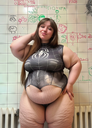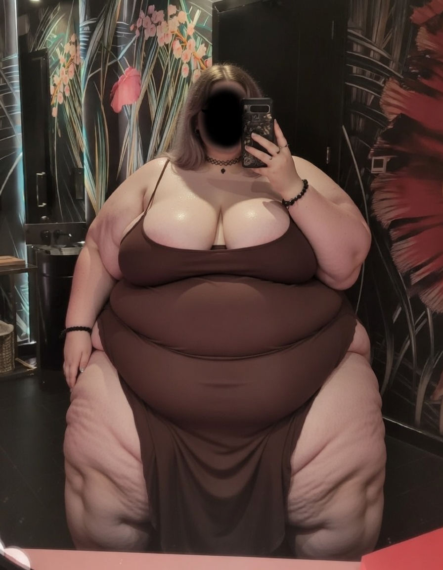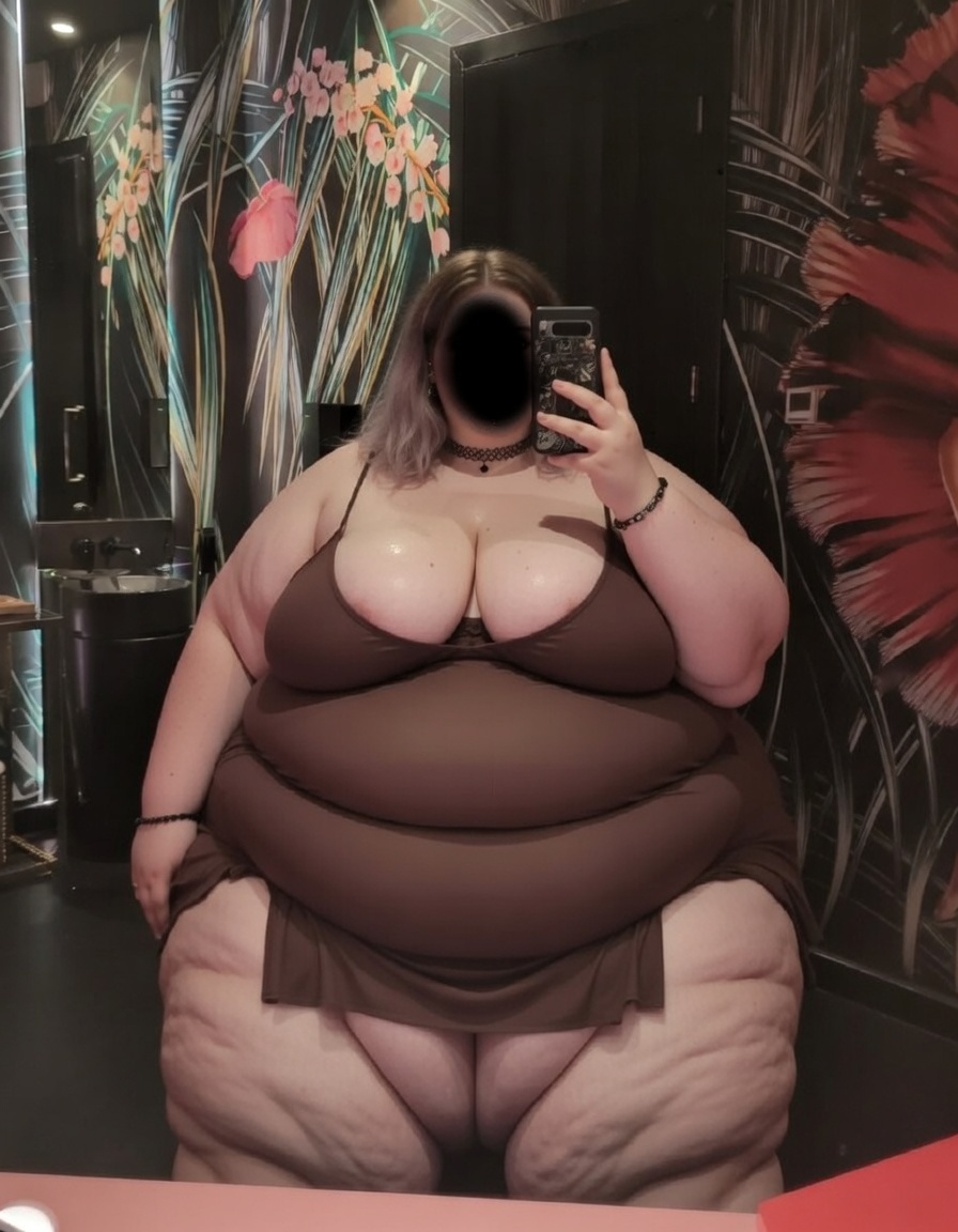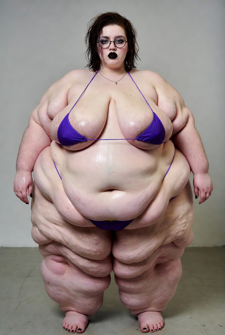 Grok just works too well, got this image with this prompt. Just add your own in the chat to fatten it up. Create/Make this image a highly detailed, realistic photograph of a very extremely obese young woman in her early 20s, with a super-super-sized body type (SSBBW). The woman should have massive, exaggerated proportions, including an enormous multi-tiered sagging belly with multiple heavy soft rolls and deep folds hanging far down over her lap and thighs. She should have extremely wide pear-shaped hips and massively thick thunder thighs covered in realistic cellulite dimples and ripples. Her arms should be huge and plump, with visible hanging fat rolls and bingo wings. She should have very large, heavy breasts with an extremely soft, jiggly, realistic fat texture. Her skin should be natural and pale, with authentic stretch marks and subtle visible body hair on her arms and lower belly. There should be a slight sheen of sweat on her skin. The woman should be standing in a full-body frontal pose, wearing a tiny strained purple string bikini with thin halter straps and a micro thong bottom that barely contains her massive lower belly and hips. The yellow bikini fabric should dig into her soft flesh, creating deep indentations. She should have black glossy lipstick, thick black eyeliner, and round black-framed nerdy glasses. Her hair should be wet and messy, shoulder-length, and dark brown, with strands sticking to her face and neck. Her toenails and fingernails should be painted black. She should be wearing a delicate silver necklace with a small pendant. The setting should be a plain light gray concrete studio floor with a neutral, minimalist background. The lighting should be natural soft daylight, with realistic shadows and skin texture details. The photograph should be photorealistic, ultra high resolution, 8k, with sharp focus, and in the style of a professional studio portrait.