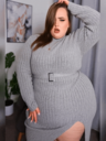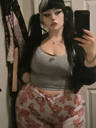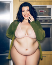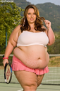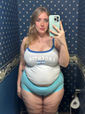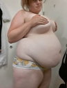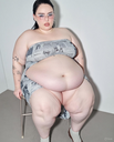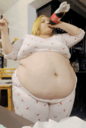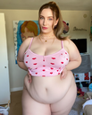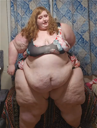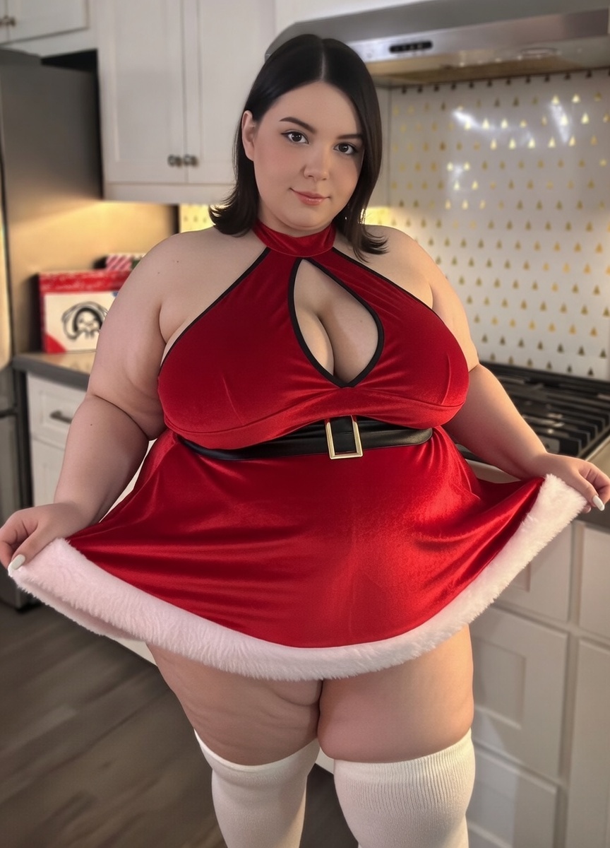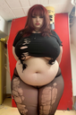 make her noticeably 500lbs fatter, give her an hourglass figure with large, smooth hips and thighs, and large soft tits. make her belly smooth, round, soft, and hanging. make her outfit too tight for her and ripped from strain. put her in ripped transparent black tights. give her a distressed, confused, exasperated, and slightly horny expression on her face.