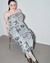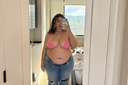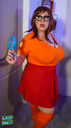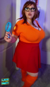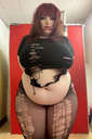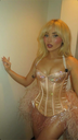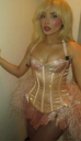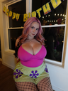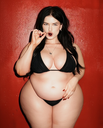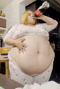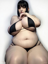 make her noticeably 500lbs fatter, give her an hourglass figure with large, smooth hips and thighs, and large soft tits. make her belly smooth, round, soft, and hanging. make her outfit too tight for her and ripped from strain. put her in ripped transparent black tights. give her a distressed, confused, exasperated, and slightly horny expression on her face. bursting out of corset.