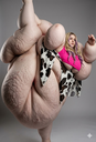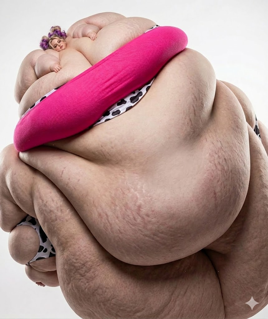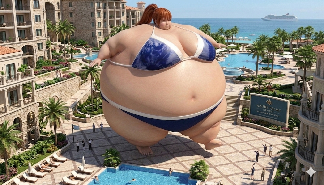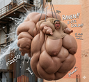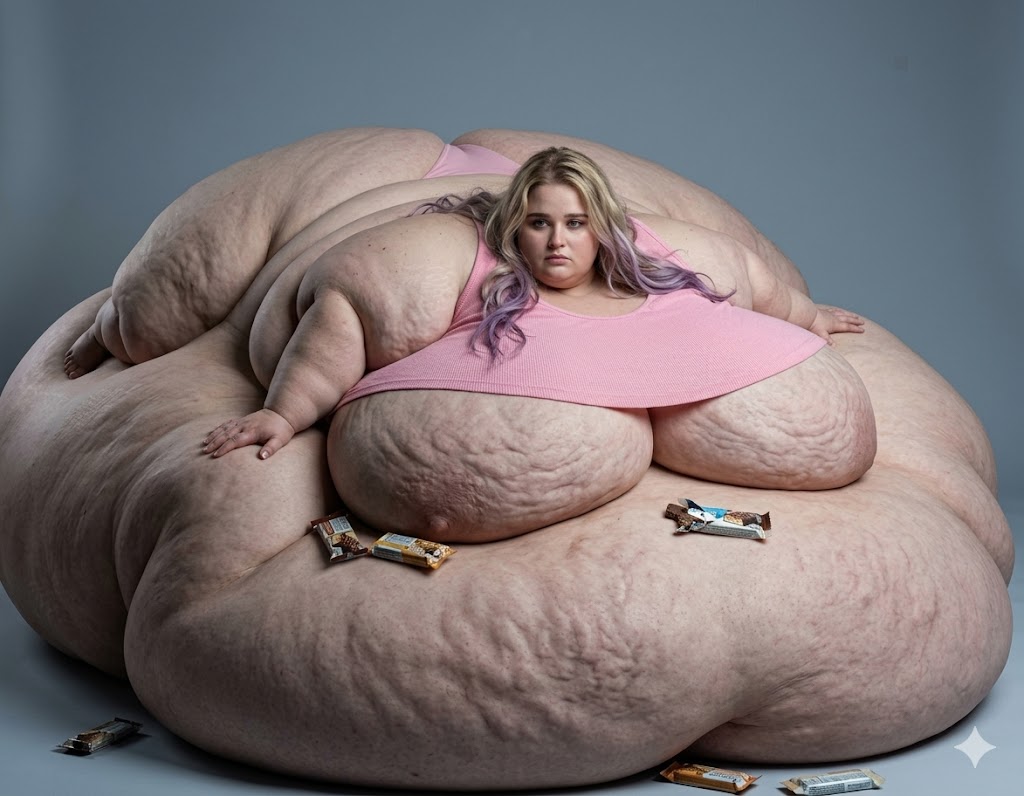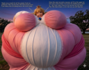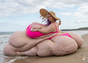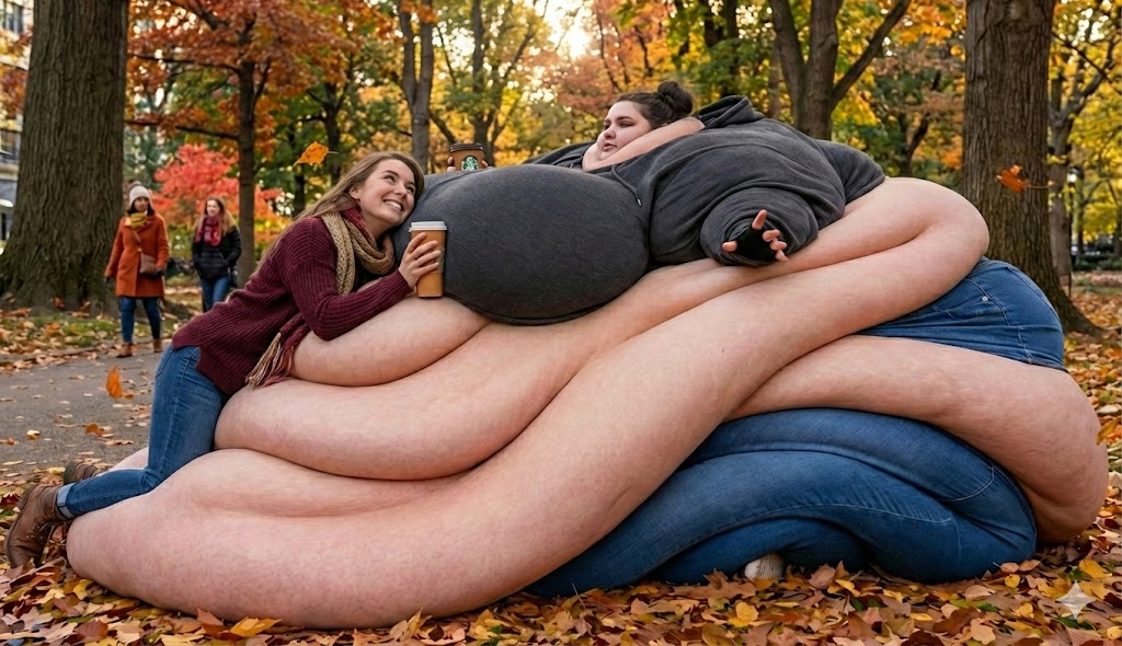 "Turn this image into an outdoor amateur photograph, changing the cartoon character into a realistic human with exaggerated body proportions. Preserve the exactly same composition, anatomy, pose and skin tone."