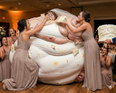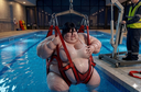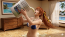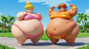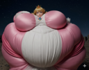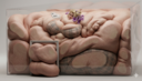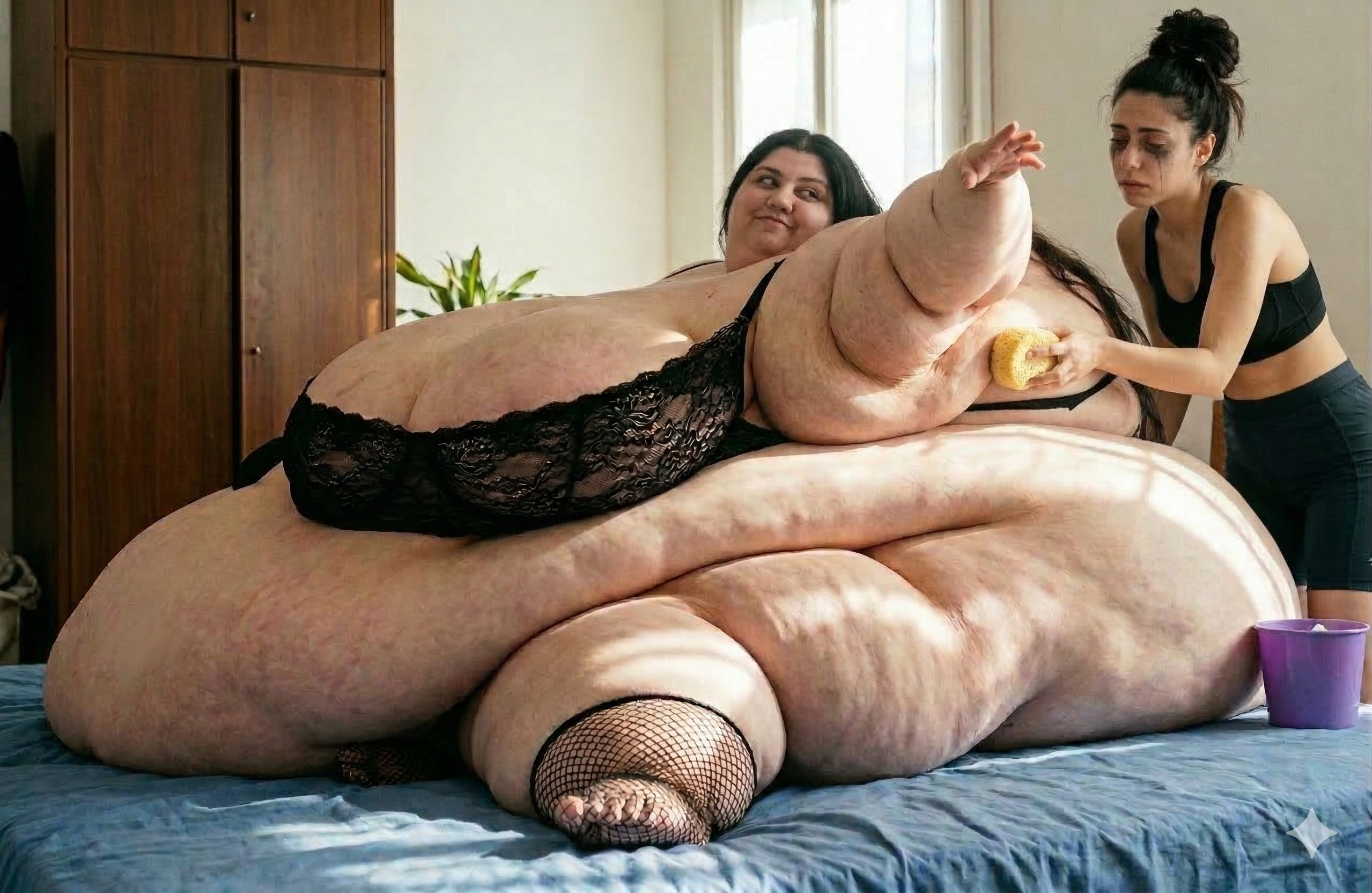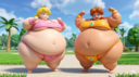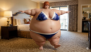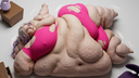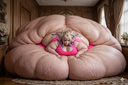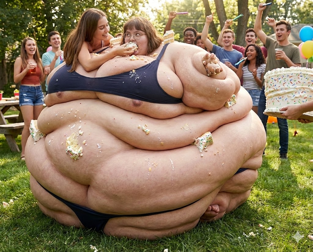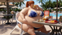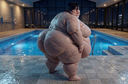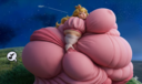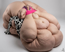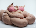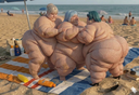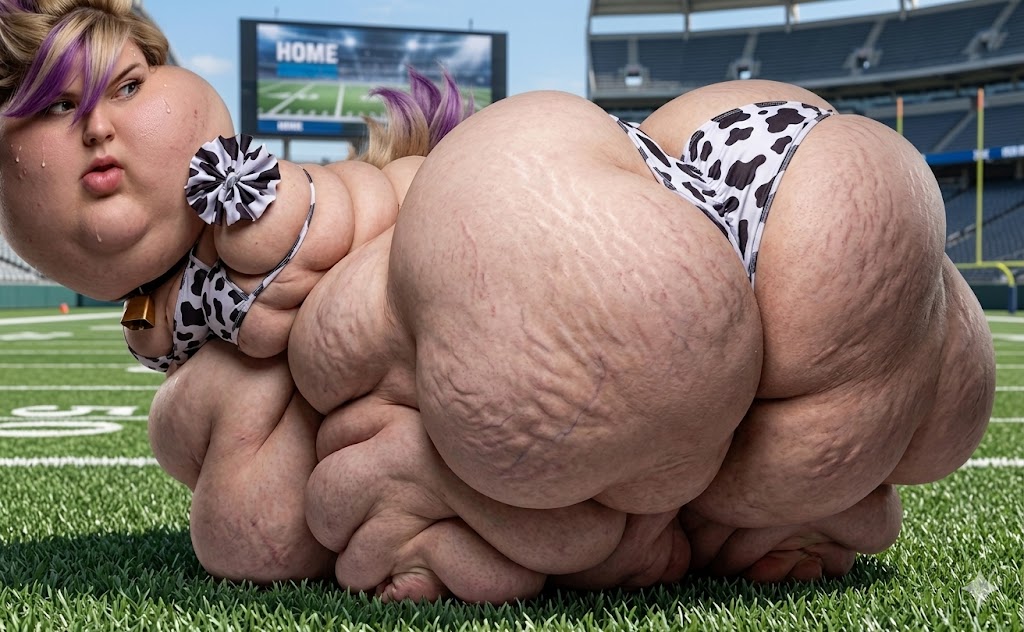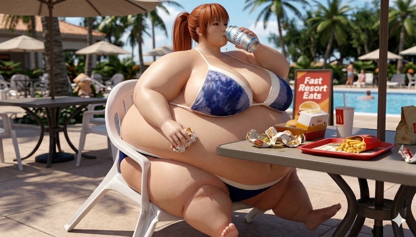 "Turn this image into an outdoor amateur photograph, changing the cartoon character into a realistic human with exaggerated body proportions. Preserve the exactly same composition, anatomy, pose and skin tone."