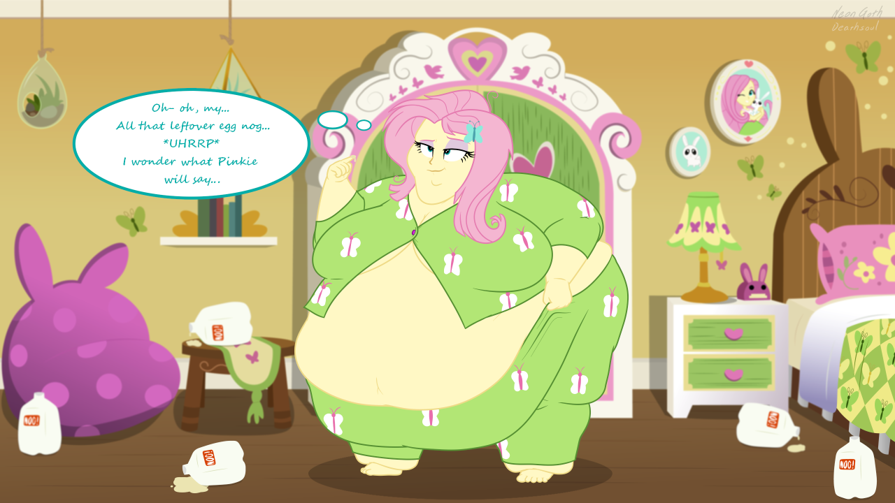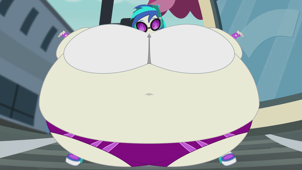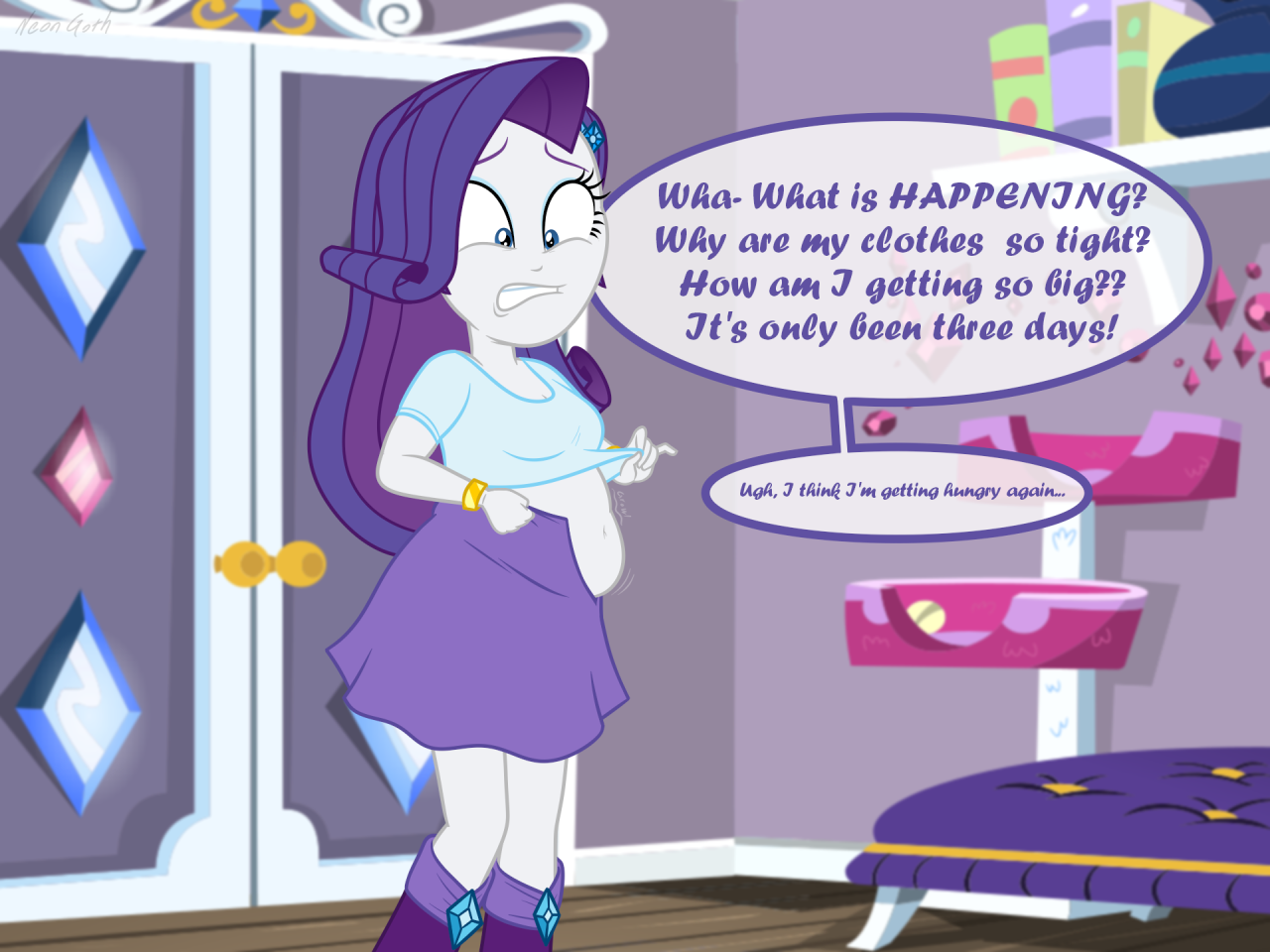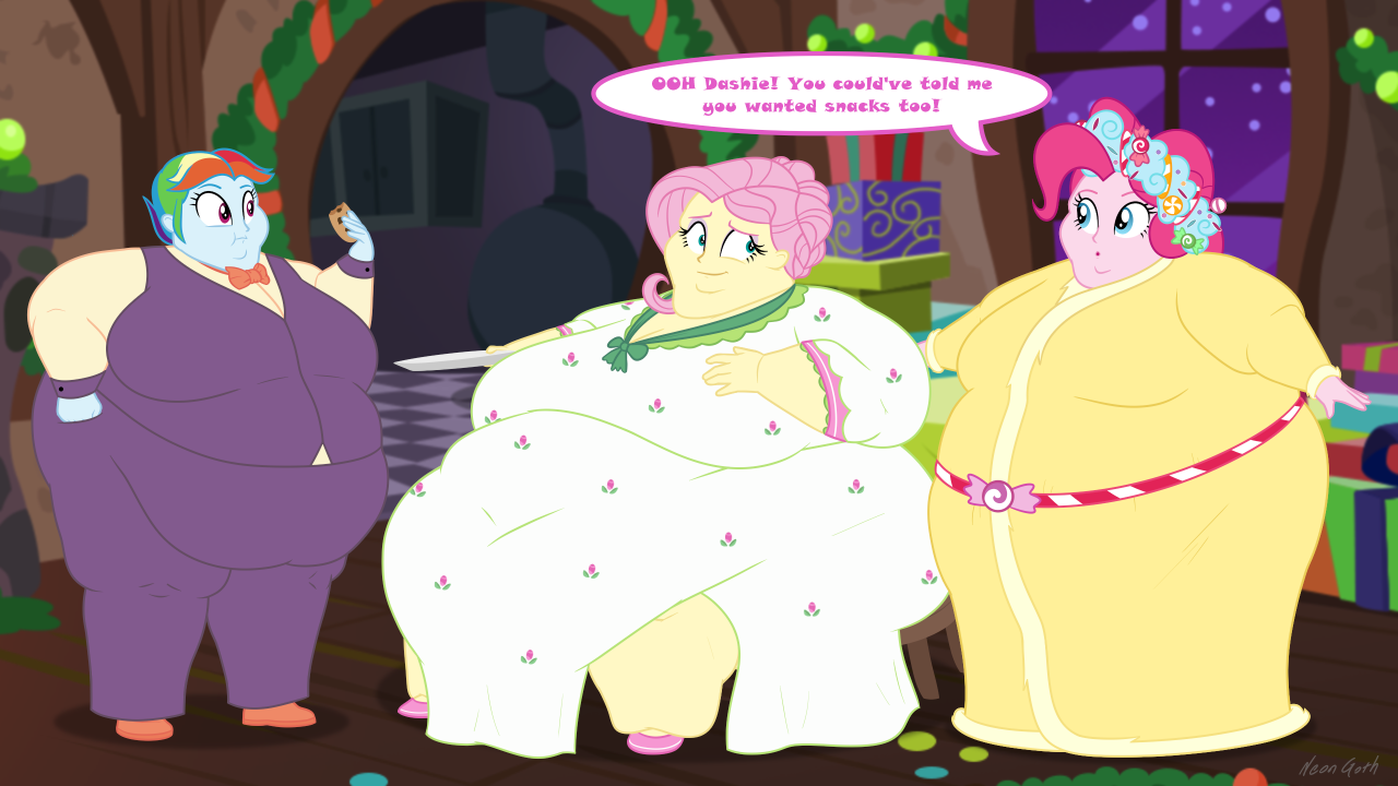 Looking down again at that cumbersome brace, Rainbow groaned as she fell back on her bed. She cringed slightly as she felt her flabby gut wobble beneath her skin-tight tee, dreading what’s to come of her growing waistline.