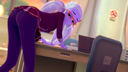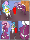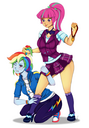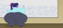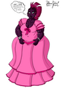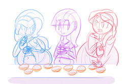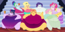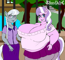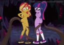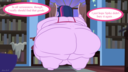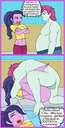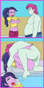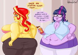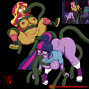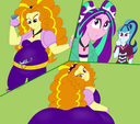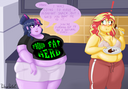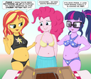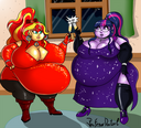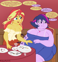 New Unexpected Grimphantom piece with Sunset trying to fit into Twilight's outfit but to no Avail, with a butt slap by Trixie too.