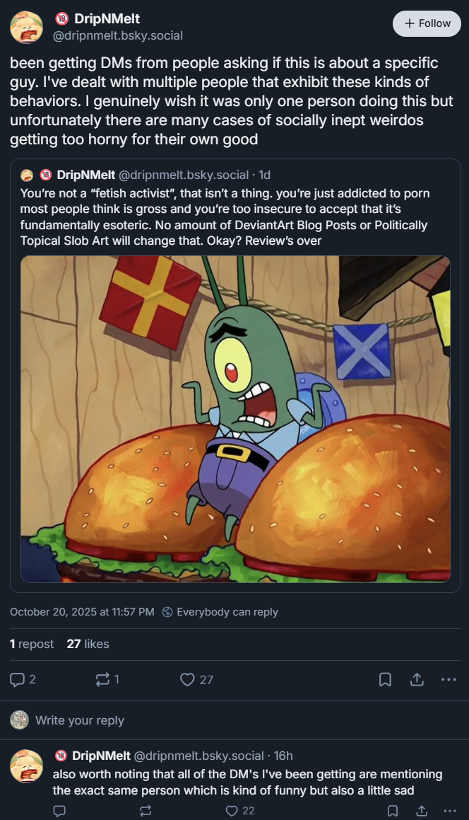 >>102346 Ngl, my first initial thought upon hearing this was good fucking riddance. The guy fell off so unbelievably hard recently and his debilitating degree of autism made him one of the most obnoxious personalities within the fetish art community in recent memory. That being said though I have a bunch of his bluesky art from 2024 and the majority of his pre-fatty's den work saved. Give me some time and I'll collate all of it into one big collection. His DA was only deactivated within the last couple of days it seems, so it should still be possible to scrape his content from the server. I think everything he's put out for the last few moments has been absolute dogwater, but for the sake of completeness if I can retrieve the contents of his DA account then I will include them. He'll also be back, inevitably. I mean my god this is like...the 5th time he's pulled this stunt? He's a fragile pansy who'll delete his account anytime he feels marginally upset and then make a new account later, I really wonder what caused him to sperg-out this time...