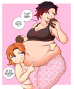Could someone help me? I’m looking for two DeviantArt stories—one in which Winter starts gaining weight after drinking a gainer shake laced with dust, and another where Jaune uses his aura through massage to fatten up the girls.