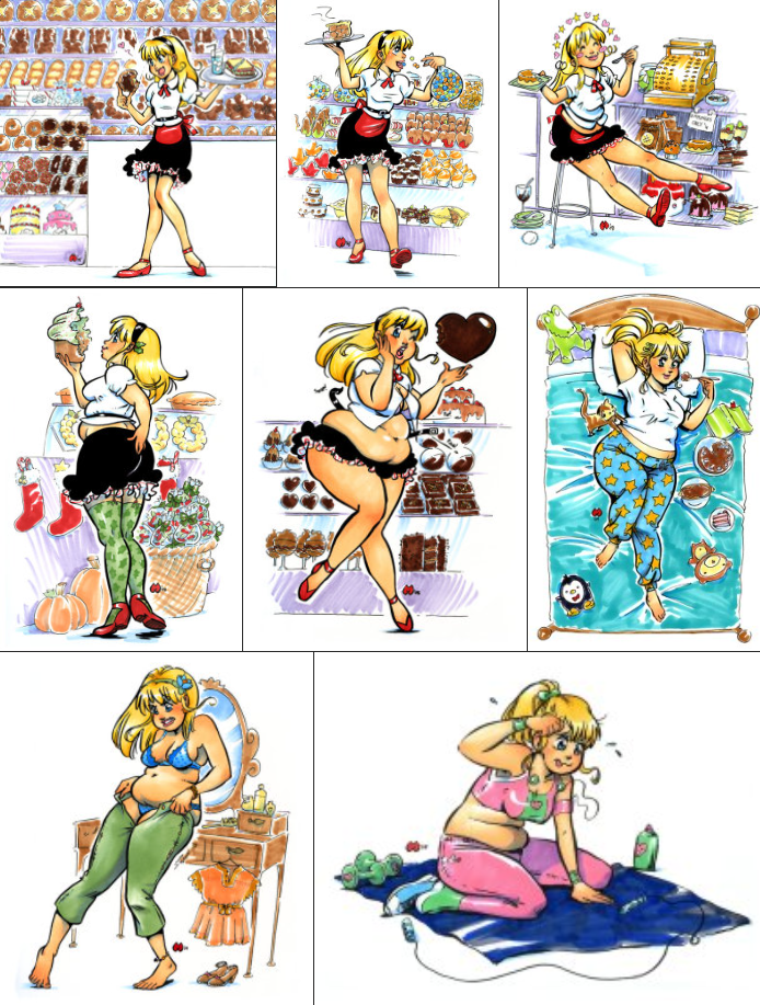 There was this three part sequence by the upright man about a girl who wants to gain weight. By the third panel, she's too fat to move, and she's suddenly anxious when her feeder still wants to make her fatter. Does anyone have it? I saw it here like a decade ago, but forgot to save it.