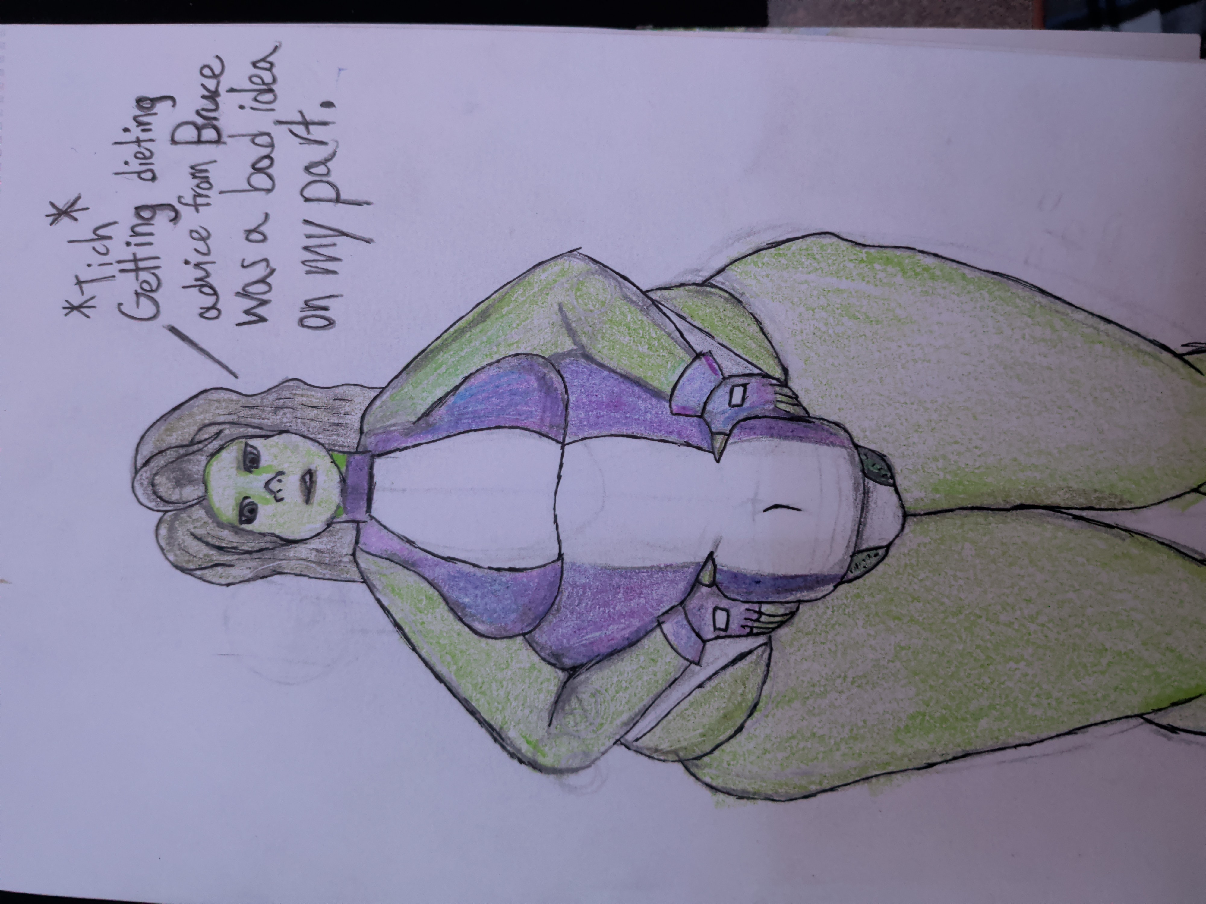 Can you draw She-Hulk in a similar shape to this, with big thighs and stomach, sighing and saying “I shouldn’t have been on Bruce’s diet" >>299200