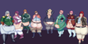 Can someone help me figure out who is dressed as who in this picture? Left to right: 1. ??? (OZ uniform) 2. Lunamaria Hawke (Earth Alliance uniform) 3. ??? (A-LAWS uniform) 4. Relena Peacecraft (Celestial Being uniform) 5.??? (???) 6. ??? (Gjallarhorn uniform) 7. ??? (ZAFT uniform) 8. Christina Mackenzie (Tekkadan unifrom)