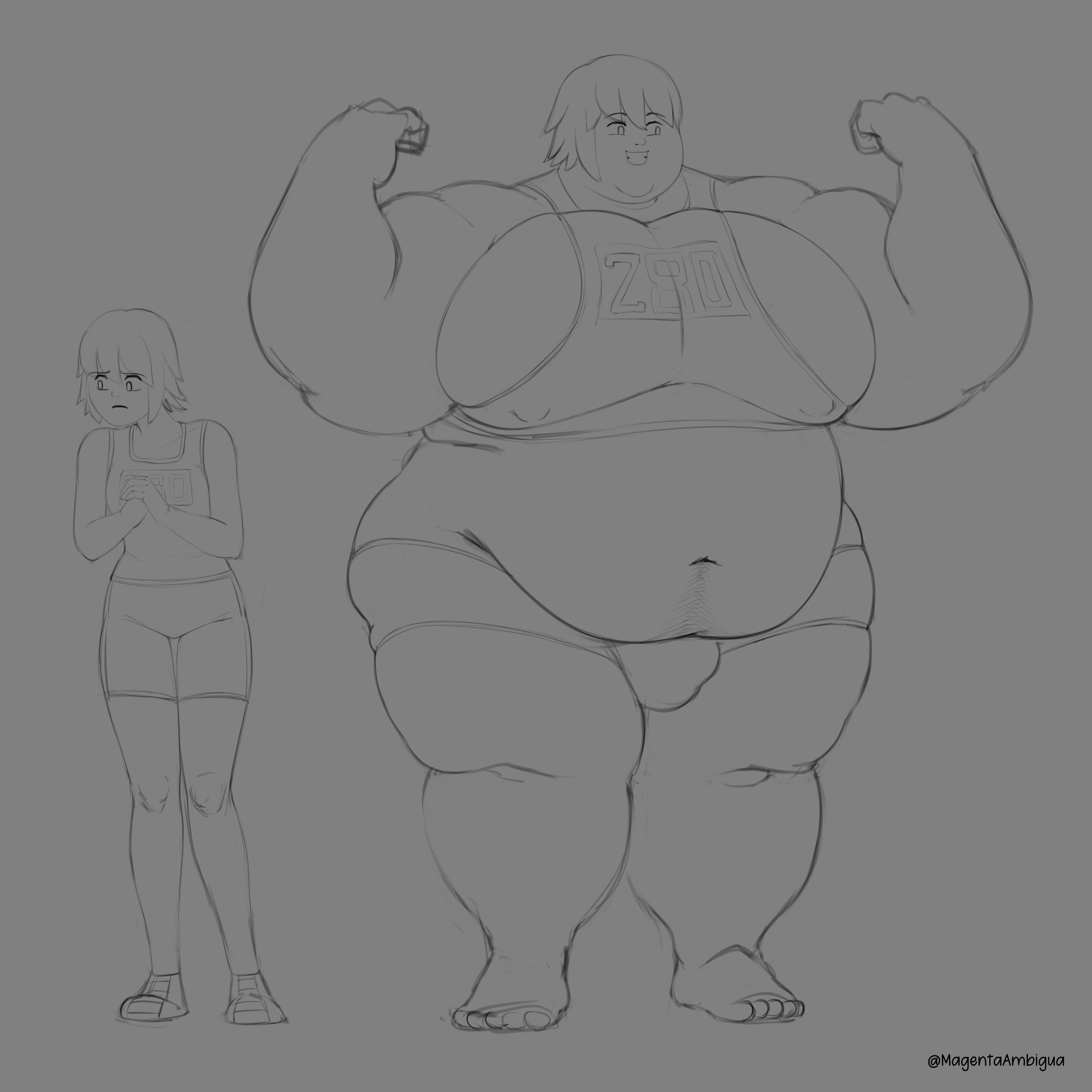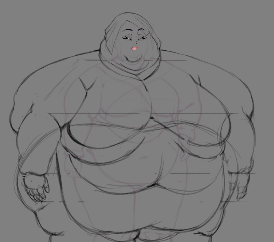 >>296717 >but when the forearms gain not one, but two flabby rings that might be a misunderstood detail, in the current sprite the flab on her arm is supposed to be an indentation caused by her tight sweater but I do get what you say, the first examples you used are both from commissions and in those cases I'm simply doing what I'm told, your references from softon are valuable because that's an artist I look up to > I don't feel like there is enough time focused on Vero adapting to her new reality. Have her discover that she got new friends alongside Valeria? this is precisely something I have planned, IDK if you've noticed but when she's in college she never goes to classes, or well, you never see her inside a classroom, my plan is to introduce more of her friends in those scenarios so new social events can be developed later like the party you see in the newest builds, and as far as adapting to her new reality is ALSO something I wanted to further explore with the classroom scenarios, like having her break chairs, feel embarrassed for showing up so fat for classes, or maybe even haver her stomach make noises in the middle of a lecture but STILL, I always welcome any constructive feedback no matter source >>296720 the first example you used is from a very old and very rough sketch I did where I was playing with a super flabby look for her, I guess you want to see something more like that? either way your comment on her hands being too big is noted >>296725 this, again, these are commissions and OK, clients can ask for sizes but its up to me to properly draw those parts and trust me when I say that I DO pay close attention to the way softon draws them. that being said these are the changes I'm making to ssbbw vero based on your input, this means that I'll have to redo a lot of her sprites but I do feel these changes are necessary, I left the original bbw sketch below for reference, something I noticed is that perhaps I made her shoulder fat a bit too excessive giving her that square look, it's something I've been doing since ever and something I like to emulate from other artists but perhaps its not the right fit for this project, again, feedback IF constructive will be always heard.