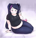 Just remember that it showed the same girl twice, one in casual clothing with her belly hanging down and another where she’s wearing a purple office suit with her belly hidden. Had glasses and purple hair. It was an oc comm around February/March of this year. Thanks a ton if this gets found.