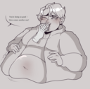 Not art (yet) but I literally don't know where else to put it so I'll put it here So there's this web comic called "Randal's friends" and in it there's a story arc where the protagonist have to deal with a group of creatures called ratmen infesting their house. Ratmen are basically just small humanoids with rat ears and tails who are fully sentient and otherwise just regular humans. And the leader of said rat pack (there's 5 of them) is Robert Takeuchi (picrel) and holy fuck he's literally perfect for WG scenarios. One, he's perpentually hungry (so much that he can't focus on things sometimes), second, he's an alcoholic (frequently depicted drinking stolen beer) and three his favourite food is pizza (should be obvious). Plus from personality stand points he's also perfect for forced/corruption WG stuff. For instanse it would be pretty easy to bribe him with food and get him drawn out of hiding to be fed even more, against his will too. Just imagine catching him in a moment of uncautiousness and tying him up to force feed tons of fatty junk, seeing the zipper on his shirt break and exposing his round full tummy. Or, in another case scenario, domeniscating him (via bribery too cause why not) and spoiling him rotten with all the beer and pizza he can ever imagine. Rats are small and gain weight easily when fed well and ratmen are basically just rats who look like humans and can think so seeing him gain kilo after kilo and being confused/scared about it would be so hot. Reassuring him that it's okay and he doesn't need to worry about becoming huge, it's just a side effect of becoming a pet instead of being feral. Overfeeding him to the point of immobility and seeing struggle to move around and beg for food all the time. Teasing him with food and watching him wiggle his flabby arms trying to reach for a meal. I've been thinking about this for a week now and I literally cannot handle these thoughts anymore, fuck. The worst part is that I literally have nobody to discuss them with because there are 0 BHM/inflation lovers in the Ranfren fandom and nobody here even heard of it. Robert isn't even my favourite character but he's perfect for my fetish, FML. I'm gonna draw huge Robert and post it here eventually to keep it the thread on-topic but have this for now I guess idk