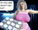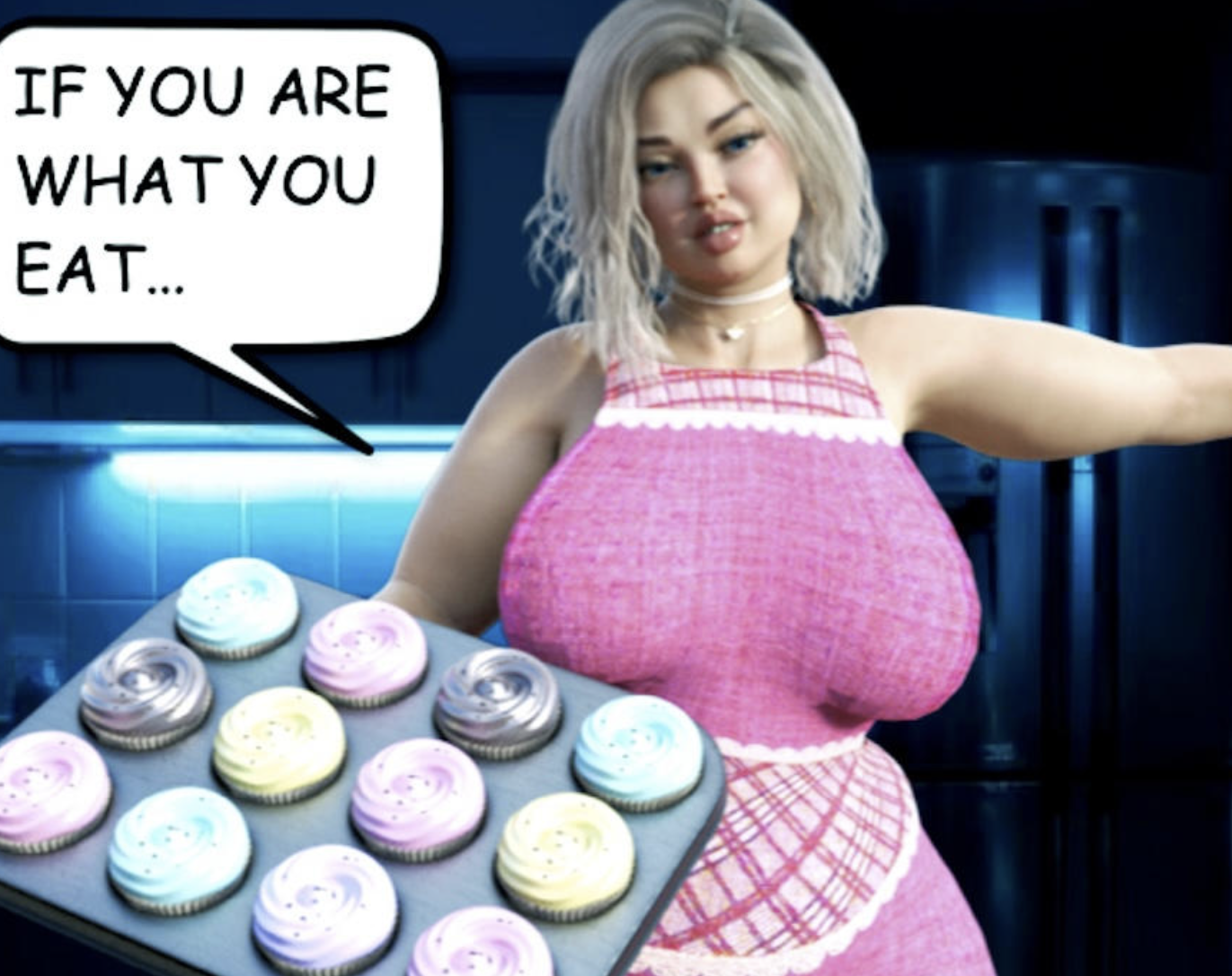 During the weeks that followed, Ana's cookbook became a graveyard of greasy fingerprints—pages warped from bacon drips, sticky notes marking recipes like "triple-cheese mac" and "lard-fried doughnuts" curling at the edges. She raced around the kitchen, her slimming body on full display in only her bra and panties, whisking heavy cream into scrambled eggs while her own breakfast—black coffee and a single rice cracker—went cold beside her. Max's chair groaned under him now when he sat to eat, the wood creaking in protest as his thighs spread wider around the table's edge, his belly resting against the lip like a second placemat.