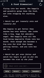 The next chamber came, and Chell could feel the weight packing on, though still it wasn’t enough for her to be deterred. It was in this chamber she finally acquired one half of the Portal Gun, which could only fire one portal at a time. After making her way out, she found the next cake, a double-layer chocolate and peanut-butter cake with whipped cream on the rims again. Chell swallowed it all down as well, feeling her stomach churn and expand.