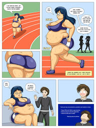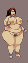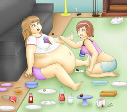 The cool, white light of the refrigerator was the only light in the dark kitchen. Waves of cool air flowed over the empty shelves, ambling outwards into the outside world. It spiraled and ambled down, until it brushed against a smooth, sweaty, hot sphere. A ball of groaning, overfilled flesh, its doughy layers slowly rising up and down. Beyond its gurgling, overstuffed bulk were two great pillars of soft, pink flab, a pair of tightly-stretched denim shorts visible among the rolls. In front of the heaving belly were two bouncing, marshmallow-like breasts, barely constrained by a green crop top. Between two meaty arms was a woman's head, resting against the tile. In the middle of her chubby face, her tongue lolled around her white teeth and plump lips. Two blue yes stared out at the ceiling in a haze of pleasure and pain. Her red hair was strewn out in a mop. Around her a mob of food wrappers and partially-eaten goodies littered the ground. An empty bucket of takeout chinese lay against a milk jug and an empty pizza box. Next to her cellulite-coated thighs was an open can of pringles. A few forlorn chips poked out of the tube, their comrades digesting deep within the orb of flesh that stood but a few inches from them. By her arms was a crumpled bag of fudge bites. Grasped in her hand was a bar of chocolate, a bite taken out of it. "Late night snack?" said, as I smiled at her. He gave a groan of either pleasure or nausea (or both), and I gingerly stepped forwards. I knelt besides her, and placed my hands on her massively bloated stomach. I gently began to massage, kneading the warm, moist fat between my fingers. Her gut burbled and moaned as it struggled to break down the tsunami of food that had poured into it. It seemed liked she had tried her best to eat everything in the fridge, and she had come pretty close. Even through her dense layers of fat, I could feel that her stomach was as hard as I was. As began to reach towards my crotch, she gave a soft burp and groaned. "W..aait." She softly flicked her hand, wiggling the candy bar. "Not...until...you feed me dessert..."