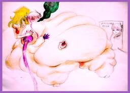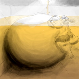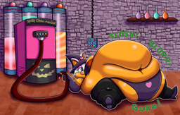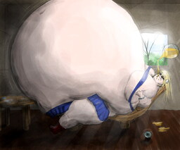 >>5319 Once upon a time, a grreedy little witch conjured an everfull flask of honey, and obviously it affected her body... and eventually, the ceiling, until she went to the basement, on her quest for more food and magic - and fell asleep there. Waking up, she realized she forgot something - the everflowing honey flask was still doing it's work! Now the cellar is nearly full of honey (and witch :-p) and like Goethe's Apprentice Wizard, she's gotten herself into quite a predicament. Far from despair though, a mix of greed, megalomania and a bit short-sightedness has helped her to decide on just drinking the honey faster than the flask can pour... all while she's growing fatter and rounder...! Eventually; Slowly, but steadily she managed to catch up with the flask, consuming more and more honey in the process. Not only did her absurdly large tummy expand from the sweet filling, but over time, her body started converting the nourishing liquid into more and more layers of fat... Soon, the constricting tightness of her master's quarters couldn't contain her vast bulk and gave way - but she was set on her task. She would not lose to a mere item of her own conjuration! Bigger and fatter her belly grew, lifting her up, until finally, she managed to snatch the devilish device and closed it shut. Satisfied, she gobbled up the leftover honey thinking of leaving no trace of her mishap, blissfully ignorant (for the moment) of the havoc her monstrous meal had caused. If one were to walk by now, one would be able to observe a bizzare scenery: A huge crater where once a Warlock's Den had been, some rubble and some puddles of honey spread around and in the middle of it, a cute but unbelievably fat young sorceress, resting on her swollen paunch - of which only the top part was visible - the rest (like an iceberg) hidden inside the remains of the home, it's size one could only imagine...
