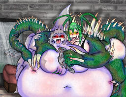 "J-just shut up and feed me the damn thing!" The bloated creature growled between panting breaths, her skin still tense as she felt the dangerous claws and needle sharp protrusions dance lightly across her painfully taught flesh. A massive hand caressed her side and gripped roughly on to her breast and she growled. She could feel a wet tongue dance across her flaring gills and a hot breath on her neck as the squirming, suffocating fish creature squirmed in the grip of the colossal creature behind her. Once again a spoke pushed painfully into her side, and that stinger grew ever closer to puncturing and rupturing her too full stomach. "Ooooh, poor little fat shark is whining for food...." The dragon like creature hissed with multiple voices from behind her. She could feel her formidable bust squished against her back as she continued to pant. She was so full but there were still several more experiments she needed to dispose of. Binging is one thing, but it became more and more difficult the longer she had to wait between delivery of subjects, and it gave her stomach time to settle and to tell her that it didn't enjoy how full she was. She grabbed hold of the large, muscular arm that gripped and massaged her breast and leaned back to the creature, snapping her teeth at her. "J-just feed me the damn thing, you can touch my boobs afterward or something, I have an actual job to do around here unlike SOME people." She hisses. The other girl raised an eyebrow and frowned as her stinger pushed lightly against that taught skin again. "Fine... I'll keep feeding you these, and I'll do it quickly. But I'm Not. Moving. My. Tail." She said pausing between each word as her tail wriggled along her stomach, stinger pulling back, only to slowly sink back into her flesh without penetrating it. "And we'll see if your as durable as the doctor believes you are..." she hisses again, feeling a little annoyed and sadistic. She lifted the squirming and screeching fish man over Scarlet's head and lowered it down tail first into her mouth as she greedily shore through it's flesh with her serrated teeth, snorting and panting as she scarfed it down, followed by another. She could feel her bloated middle slowly expanding, pushing more and more into the micro thin point of her stinger, but once the bloating subsided, her thick skin remained impenetrable, for now at least. Echks frowned and sighed as she let go of the girl's bust and sauntered across the room, leaving her panting with the occasional belch. "Alright, time for round two, you may have taken care of the Pacu men experiment failures, however you still have yet to take care of the bio contaminants, never mind the failed clones, And while you do that, I'll be right here... waiting until your poor little tummy can't take any more.... Because as soon as a single drop of this venom hits your bloodstream, you'll be a walking blood bomb." "Why don't you save this for my sister?" Scarlet asked, leaning back and pampering her stomach as much as she could. Echks giggled, her laugh more of a sick cough than anything. "Easy. You're much more durable than her..." She hissed. "So if I can kill you. She'll be a piece of cake."