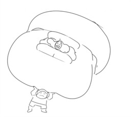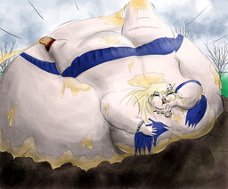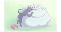 nothing short of incredible. Nowadays, none of the Sailor Soldiers would even recognize Artemis as a cat if they saw him in person again. He had no more torso to speak of, considering his entire upper body was almost entire belly at this point. His midsection was so enormous and flabby that he even sported an extra dollop of chest fat layered atop his gargantuan waterbed belly that shoved up into Artemis’ chin. His muffin top overflowed and smothered his lap and groin, and the sagging backfat he sported only rounded him out even more. His arms and legs were cradled so much fat that they swallowed themselves up in accordions of adipose. He could hardly move them anymore, and the digits on his limbs couldn’t manage any more than helpless wiggles, being weighed down by swaths of hanging fat. Every day, they grew closer and closer to being lost and smothered in his ever-flabbing limbs. But when it came to swallowing up his limbs, his butt was the most gluttonous part of this gluttonous cat. His thighs and legs became one with his enormous growing ass, which spread out along the ground by the day as Artemis continued to eat, easily becoming the biggest layer on this layer cake of a cat. Luna’s breath fluttered as she remembered how breathtaking the sight of Artemis gaining day by day was. His movements became more labored and lumbering until he couldn't move on his own. He grew more lazy and lethargic and loving, and Luna loved nothing more than to dote on him with endless treats. And nothing made them grow closer than Luna intimately feeding her growing man. “I missed you today,” Artemis said as he finished inhaling another treat. “You say that all the time, Artemis,” she said bashfully. “Because it’s true every day! You know how much I love spending time with you.” “Oh, Artemis! You butter me up, you enormous fat cat!” “Well why don’t you return the favor?” he said with a wink. Without another word, Luna clapped her hands twice. A Luna-P immediately floated around, balancing a rich cake with especially thick-looking pink frosting and a cutting life. It gently placed each thing on the ground and flew away to perform some other unseen task. Luna happily sliced off a piece of cake. She leaned on Artemis, her free hand sinking into Artemis’ fat like quicksand. With her other hand, she placed the cake near Artemis’ mouth. He took it in his jaws, but Luna let it rest on the apex of his belly before actually feeding it to him. Artemis made a questioned muffle through his cake. “I thought it would be fun if you fed it to me.” “Oh, I’ll be there in a minute, big guy!” Luna rolled over to one side of Artemis, making him giggle as his fat shifted around. “I just need to relieve some stress for a moment!” Luna then started to snuggle with Artemis’ fat belly, letting her arms wrap around as much kitty flab as she could and letting herself sink into him again. Artemis giggled again as her cheek pushed into his chest fat. He felt as warm and fuzzy as a comforter, and as Artemis ate, he felt all too happy to be her cushion. As he started to munch on his cake, Luna climbed on top of him to give him a peck on his chunky, full cheek. “Hurry up the rest of your cake.” she whispered lovingly. “I can’t wait to roll you into bed, Artemis.” “Why bother with the bed, Luna? You’ve got your perfect mattress right here.”