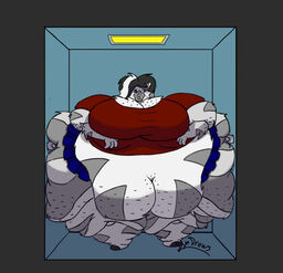 Zarah came to a stop beside the stairwell door. Although brought her momentum to a halt ripples of movement still waved over her body, clearly visible due to her much too small clothing. Almost all of the fabric of her shirt went towards covering her gargantuan bust, leaving a pitiful amount to cover her belly, which hung past her tiny skirt and down to her knees. The skirt itself was essentially sitting on top of her vast hips rather than covering them in any way, leaving her legs and rump pretty much entirely exposed. It had taken some time to find a college that would allow such a display, but fortunately this one was very understanding that even the thinnest layer of clothing would trap in enough heat to almost make her pass out. Plus the airflow felt nice against her fat folds. Right now she was also trying to prevent herself from becoming overheated by taking long, slow breaths. After all, the worst was yet to come- the class she had today was on the second story of the school building. Zarah absolutely hated stairs, which was to be expected from a 975-pound girl such as herself. It didn’t help that her hips were so wide she took up the entire width of the stairs, and even then her hips mashed against the wall and the railing on either side. As she was about to reach for the door to the stairwell she heard a ding. Turning around she saw the doors to the elevator on the opposite wall open. Surprisingly, Zarah used elevators a lot less than stairs- being such a big girl she didn’t fit in small spaces very well, and as such she was a bit claustrophobic. Not only that but she knew that if she got in an elevator there would be no room for anyone else. But this elevator was completely empty, and she only had to go up a single floor. She looked back at the stairwell door, then to the open elevator before swinging her massive form around and walking towards the opened mechanical doors. She made sure to hit the ‘doors open’ button in hopes that they wouldn’t try to close on her as she got in. The gigantic zebra was about to start squeezing through the much too small gap when she remembered the last time she had used an elevator. It wasn’t big enough for her to turn around in, so when she arrived at the floor and the doors opened she had to back out of it, which was awkward since she had no idea if anyone or anything was behind her. With this in mind Zarah turned around in order to back into the elevator. She made sure to angle herself sideways a bit since her front-to-back length was merely eight feet, compared to her ten-foot wide hips. Though door was wider than average, it was still only a measly five feet. Fortunately about seven of her eight-foot front-to-back dimension was pure body fat, meaning it could squash inward significantly. She started forcing herself through the gap, feeling the cold wall against the side of her belly and rump. Taking a deep breath she tried to suck in her gut, making her a whopping 1 ½ inches thinner. Zarah continued to push herself against the gap, wiggling back and forth to get her colossal form through little bits at a time. The doors suddenly tried to close around her, causing her to let go of the breath she was holding. The doors struggled for a moment, squashing her butt and belly even further, before giving up and re-opening. Seeing her chance, Zarah pushed herself again. The elevator doors had squashed her enough that the entirety of her belly passed the threshold. There was an audible smack as her hip smashed into the back of the elevator, which also caused her body to wobble madly. She quickly twisted herself around so that she was facing forward, forcing her other hip through the door. The result was a very squashed Zarah- she guessed the elevator was only seven feet wide at the absolute maximum. This resulted in her hips and rump riding up her back and sides, as well as falling further down her calves. The gargantuan zebra took a deep breath, then let it out slowly as she smiled. The whole ordeal had taken several minutes, but it had been a lot less trouble than trekking up the stairs. Carefully, she leaned over and pressed the second floor button. The elevator made a terrible buzzing noise. Zarah tilted her head to the side as her eyes darted across the control panel until they fell on a small line of text. Weight limit: 800 lbs “You have got to be kidding me.”