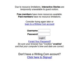 >>9 You should've started the thread with >"Just a minute... Interactive Stories are temporarily unavailable to visitors and free members. >>11 Same here, I'm sure writing.com introduced something on the backend to prevent the script from working, because of course they did. I swear that site is just straight up garbage. Maybe if they did a purge and got rid of the ten thousand "inter actives" that have two lines in them and haven't been touched in ten years and the creator left the site instead of trying to get everyone to pony up to use their site, their server costs wouldn't be so high.
